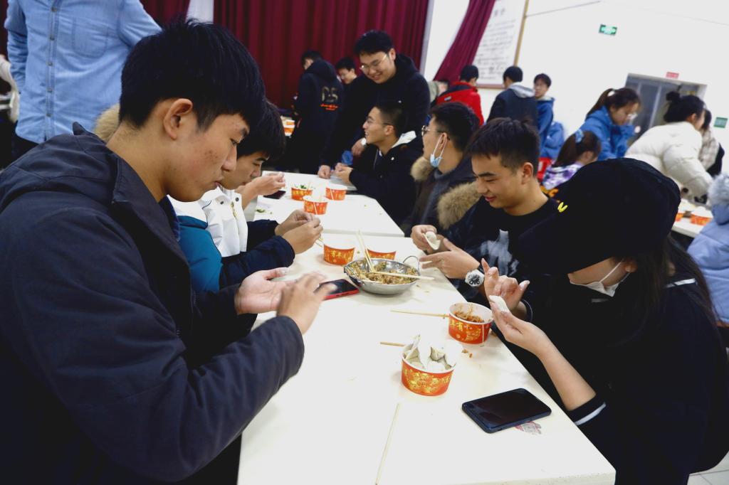 包好的饺子一部分下锅煮,一部分上锅蒸,饺子在沸水蒸笼中渐渐变得洁白透亮。在等饺子蒸熟的过程中,学生代表们分享了学习的经验。来自2020级教育学专业学生代表周卿分享了学习数学的经验,提醒大家上课学习不能松懈,提前为期末复习做好准备。饺子出锅后,学生们端起碗筷,一齐起身去尝饺子。“哎呀,这个是破的”“熟了熟了,好香,快来尝”,现场响起一阵阵的欢笑声。饺子宴结束后,还有一些学生贴心的为因有课而不能到场的同学打包了水饺,分享这份快乐。