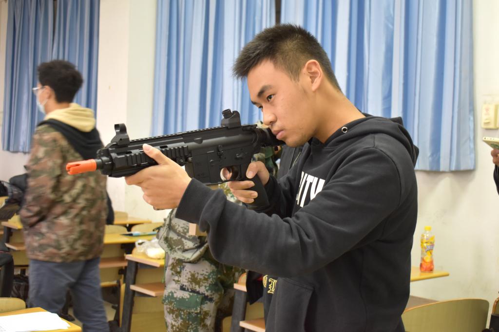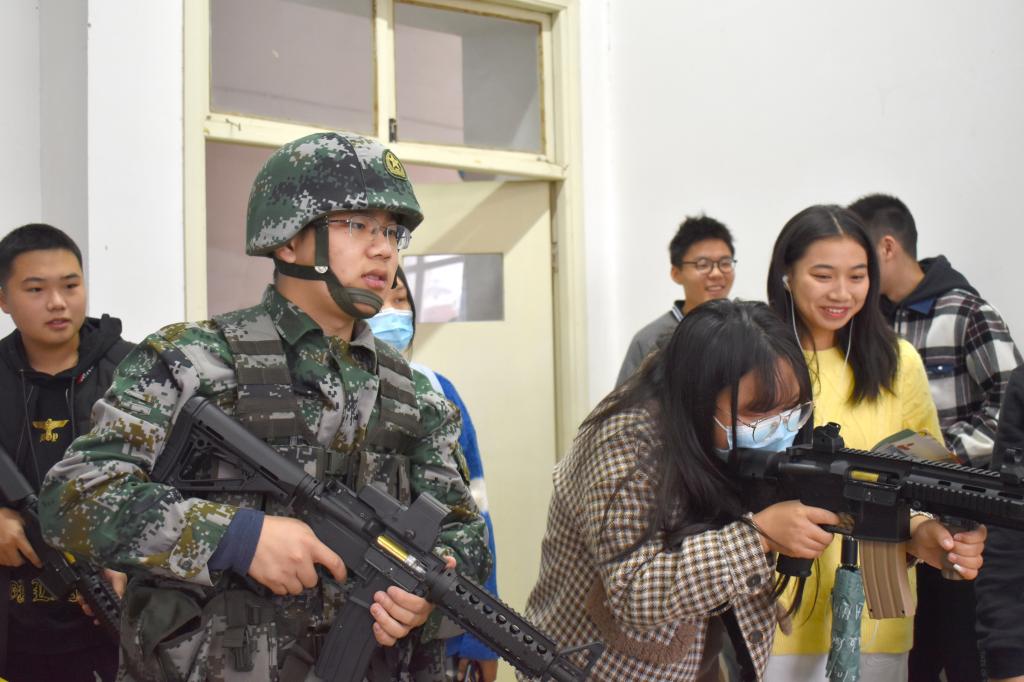 军事观察协会的成员们身着迷彩服、斜挎一把锃亮的仿真手枪、胸前背着军旅包,在各个场地来回“巡视”,吸引了一大批学生驻足围观。进入军事观察协会的招新场地,成员为前来了解的学生们准备了射击水瓶的活动。装弹、闭眼、瞄准、射击!一系列动作一气呵成,“啪啪”几声,水弹便在目标物上炸裂,水瓶便“连连后退”。在成员进行规范地动作指导后,学生们争先恐后地拿起水枪射击,过了一把“军事瘾”。
