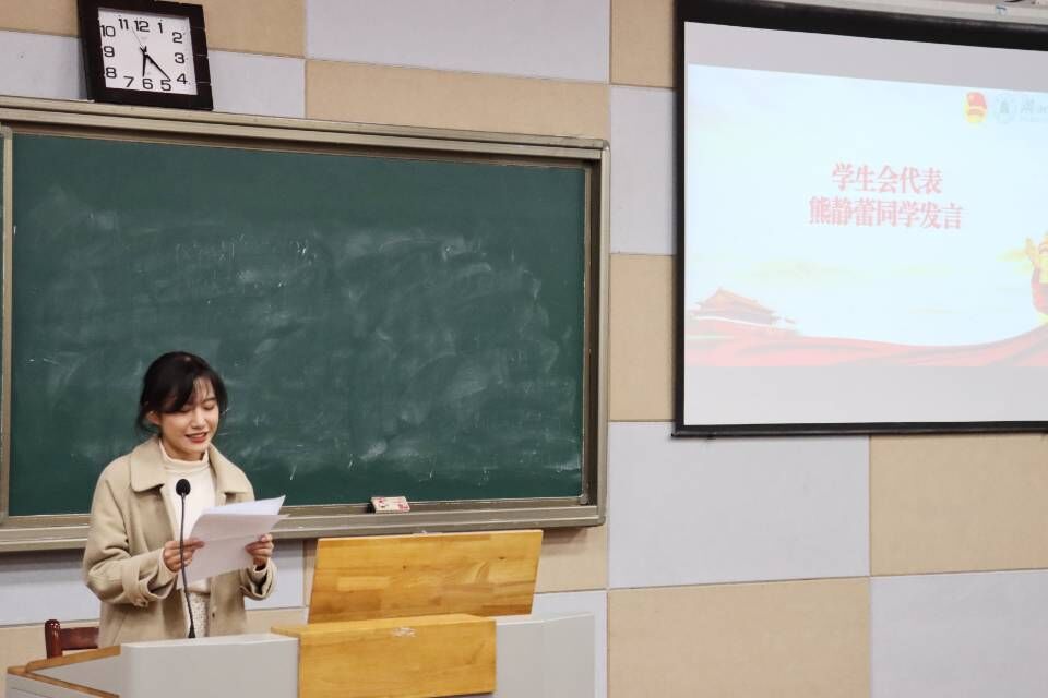 学生代表随后依次上台发言。团工委代表陈宣睿以习近平新时代中国特色社会主义思想为主题,分享了思想引领带来的巨大力量。学生会代表熊静蕾谈到,看清历史才能看清当路与前路,读懂现在与未来必先读懂过往,呼吁同学们自觉以习近平新时代中国特色社会主义思想武装自我头脑、指导自我实践。