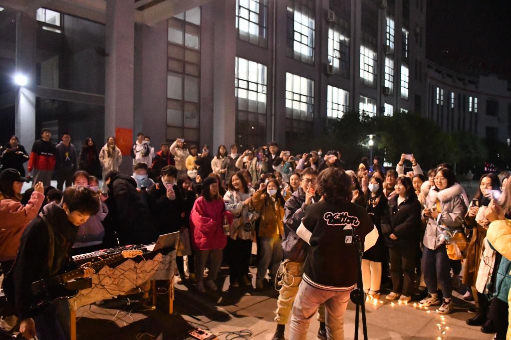 12月19日晚,Sin原创音乐社在A级内射毛片免费的综合楼前的广场上举办了名为“丘比特的一百个梦”的草坪音乐会,湖北大学音乐人们进行了原创及翻唱演出,吸引了各习苑学生前来观看。