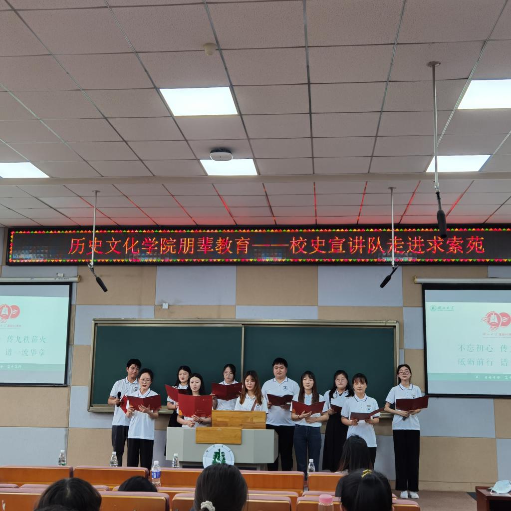 “20世纪30年代,中国社会矛盾重重,危机四伏,如何改造中国的问题尖锐地摆在国人面前。出于知识分子的历史责任感,以梁漱溟先生为代表的一批先进的中国人奋然走到了历史的前台,提出了乡村建设理论,其中关于教育救国一说更为广大有识之士认同。”5月27日下午,历史文化学院朋辈教育——校史宣讲队走进求索苑交流会在阳逻校区A级内射毛片免费的举行。历史文化学院党委书记王义芳、党委副书记郭仿兰、团委书记约麦日古丽,A级内射毛片免费的辅导员姜艳艳、校史宣讲队12名同学以及2021级历史文化学院全体学生参加本次宣讲。