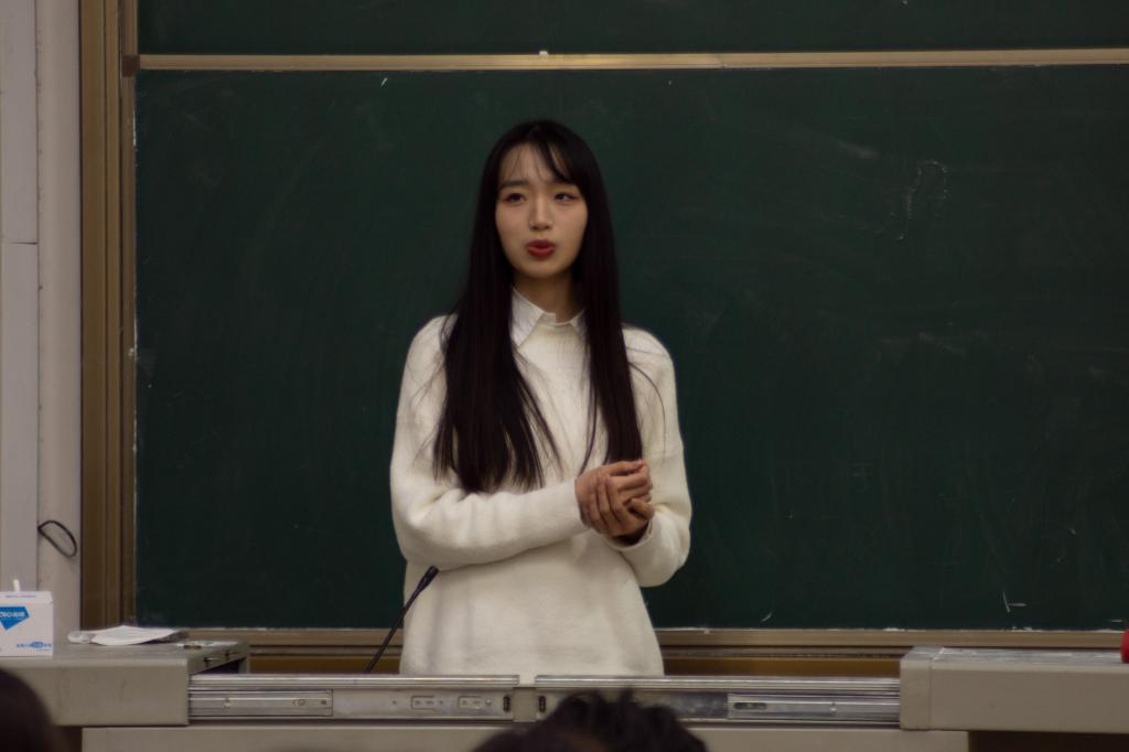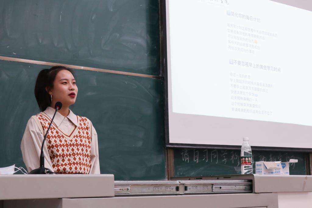 王天慧就视觉传达设计、产品设计、数学传媒设计等相关专业的基本信息及核心课程进行了介绍,并向大家分享了自己参与校庆策划和三下乡等实践活动的经历,希望同学们积极加入学生组织,积极参加各类竞赛,提升个人综合素质。为了让学生们对今后的四年有一个更清晰的规划,王天慧向同学们讲解了设计学专业课的开展方向,呼吁大家多去图书馆,把时间和精力投入到提升个人技能上,养成每天坚持动笔的好习惯。在自由提问环节,王天慧就如何为专业分流做准备、如何考研保研等问题做出了详细解答。