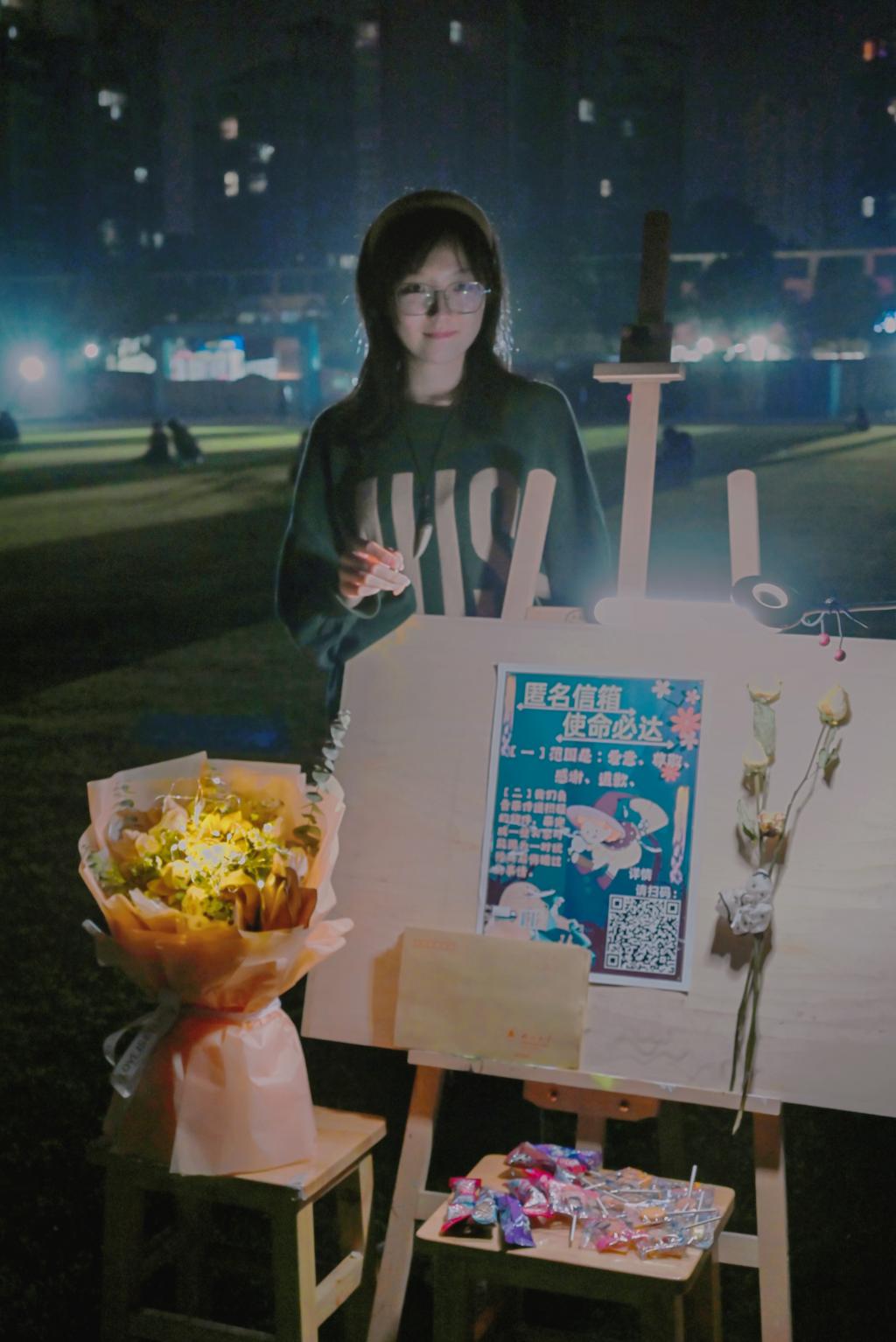 小灯照亮鲜花装点的画板,上面贴着写有“匿名信箱,使命必达”的海报——这是由艺术学院2022级设计学类专业学生马源鸿及其小组精心准备的实践作业项目。马源鸿介绍,此次活动的初心在于激励同学们以匿名书信的形式克服心理障碍,勇敢表达,大胆地去传达埋在心底的话,让青春少一点遗憾,为生活添一点光彩。