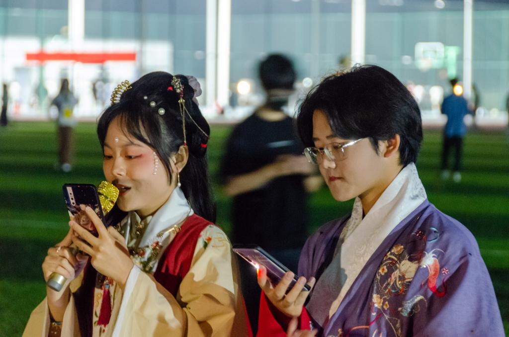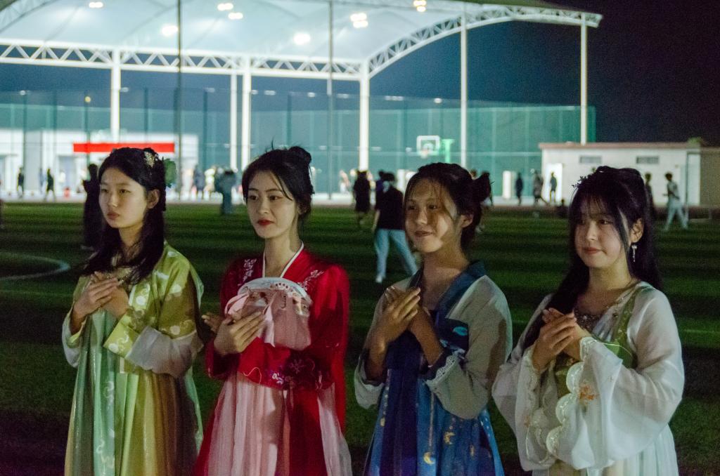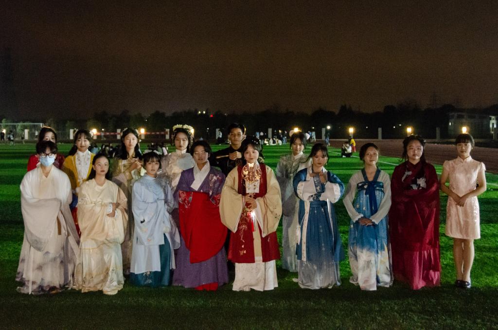 活动策划组为大家请来了一位走秀动作指导专员,指导参加活动的各位同学摆出属于各自汉服朝代的礼节动作,如叉手礼、万福礼等。主办方还邀请了几位身着旗袍的女同学走秀,以展示中华传统服饰的演变历史。走秀结束后,古风歌舞表演在夜色中拉开序幕。穿着华丽汉服的演员伴随着宫商角徵羽的乐声在灯影下起舞,裙角翩跹,舞步柔婉,吸引了不少路过的学生前来捧场。此外,主办方还设计了小游戏来活跃气氛。22级工商管理专业谢祎萌感叹:“身为一名汉服爱好者,我们想借这次聚会展现中华传统服饰的魅力,希望我们的汉服爱好者队伍越来越壮大,以后的活动能办得越来越好。”