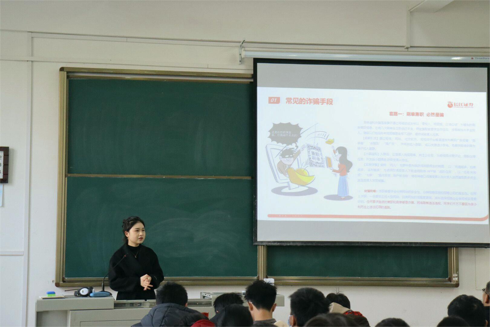 12月6日下午,长江证券投资者教育进百校活动走进阳逻校区,长江证券投资者教育专员范斯琪以“认清诈骗套路,保障财产安全”为题带来了一场生动有趣的大学生防诈骗知识宣传公益课。学院105名学生代表参加活动。