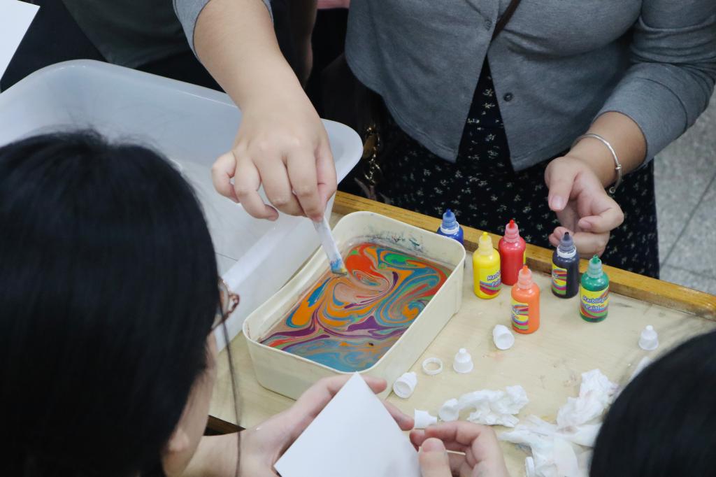 熟悉操作后,同学们纷纷开始发挥奇思妙想。他们将搭配好各色颜料滴入画液中,经“圈点勾画”后,色彩在画液中交织融合,形成各具特色的纹理。接着,他们将团扇、书签等慢慢贴于液面,两三秒后又小心快速提起。就这样,独一无二的团扇与书签陆续跃然纸上。