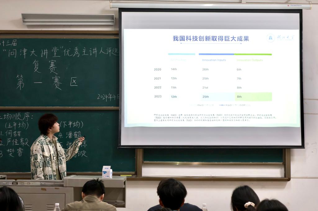 同学们的研究选题丰富,涉猎广泛。2023级人工智能专业的龚旭祺以科幻电影中各种奇特的信息交换方式为引,生动地解释了脑机接口的定义和原理。2023级日语专业的罗世蓉则从身边的事例出发,阐释了大学生榜样教育选择的重要性。各赛区主讲人准备充分,各显风采,赢得了现场评委和观众的一致好评。