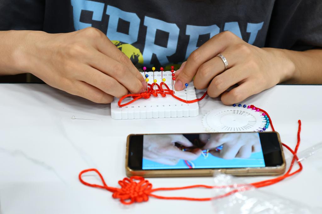 跟随教学视频的指引,学生们将丝线的一端固定在海绵板上,另一端握在手中,他们全神贯注地注视着红线,小心翼翼地完成着“翻转”“缠绕”“联结”等一系列动作。随着手指的灵活翻飞,红线逐渐展现出流畅的弧度,一个个精美的中国结显现雏形。
