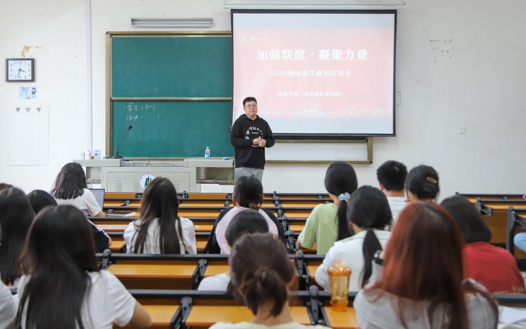 6月5日下午,师范学院团学组织“加强联谊,凝聚力量”教育宣讲会在阳逻校区B300等7个教室开展。师范学院全体辅导员、团学组织学生代表与2023级全体师范学院学生零距离谈心,干货满满,参会学生超700人。
