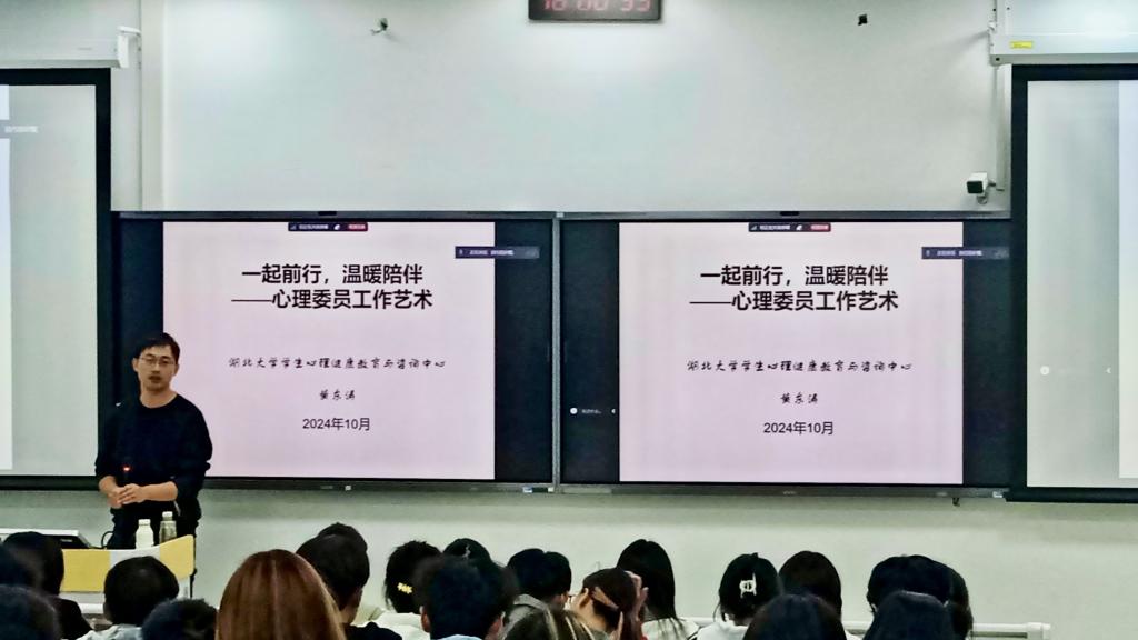 10月25日下午,我院在B100举办了以“常见心理问题的识别与干预”为主题的心理委员技能培训会。2024级全体心理委员参与培训,本次培训由我校心理健康教育中心专职教师黄东涛主讲。