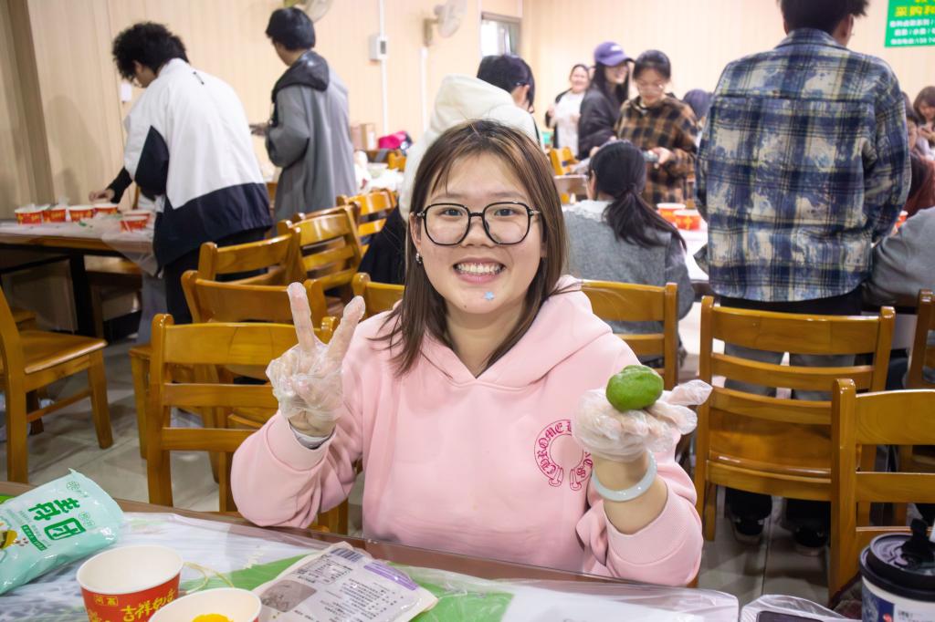 青团制作区同样热闹非凡。同学们分工协作,揉面、包馅、封口,动作娴熟。随着豆沙、芋泥等馅料被包裹进青绿色的面团中,清甜的香气弥漫开来。2024级国际事务与国际关系专业学生张宸玥表示:“制作青团不仅让我体验到传统美食的制作过程,还增进了与同学之间的默契和友谊。”
