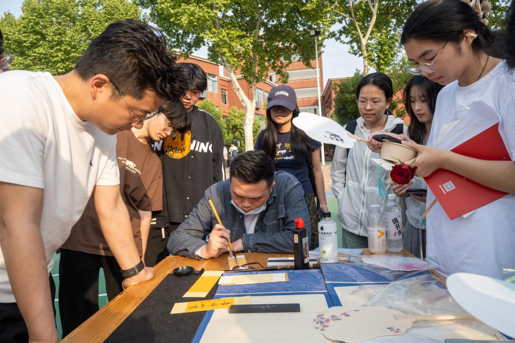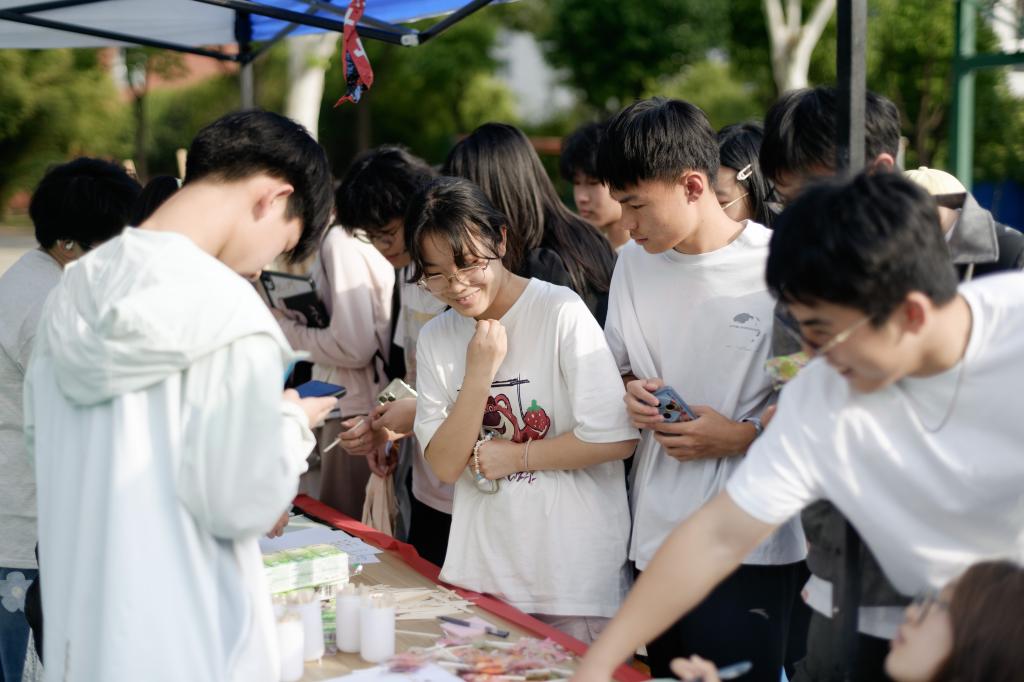 活动现场气氛热烈,传统文化魅力尽显。在互动体验区,同学们或凝神执笔,将《诗经》经典诗句精心誊写在流苏书签上;或组队协作,通过表情符号竞猜“蟾宫折桂”等传统成语;诗词爱好者们更以“春”字为令展开飞花令对决,精彩的诗句接龙赢得阵阵喝彩。许诩老师的书法展示将活动推向高潮,同学们手持自备的书签与团扇有序排队,期待获得许老师的墨宝题字,现场洋溢着浓厚的传统文化氛围。
