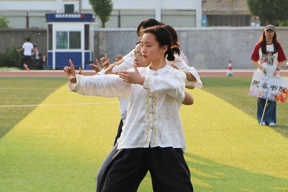 伴随着古典音乐与提示音的引导,各书院方阵依次上场。参赛者动作整齐划一,呼吸深长匀细,完美地展示了“两手托举”“摇头摆尾”“攒拳怒目”等动作。行云流水的“左右开弓”一式赢得了评选团与在场观众的阵阵掌声。
