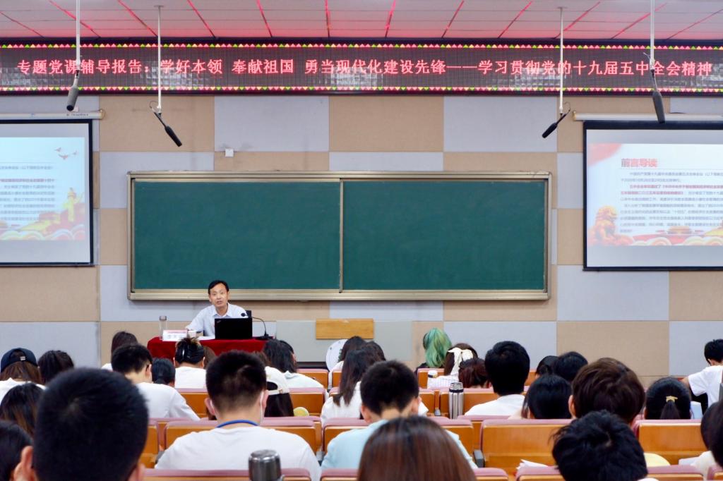 李本义首先说明了第十九届五中全会的重要性,接着具体从背景意义、精神意义、美好期待及责任担当四个方面向学生们阐释这次会议的内容。