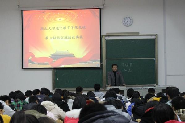 陈腾在作总结发言时指出,学员们在接受培训后思想认识有了提升,主要体现在对党的认识、入党动机、党员的基本要求与标准、入党信念和努力方向等五个方面。他还对学员们提出五点期望:一是作为青年学生,要肩负起历史使命;二是要加强党性修养,从思想上入党;三是要正确看待、理性分析党内与国家目前存在的问题;四是要正确面对党组织的考验,坚定信念,做好心理准备;五是要回归学生本质,牢记湖北大学“日思日睿,笃志笃行”的校训。