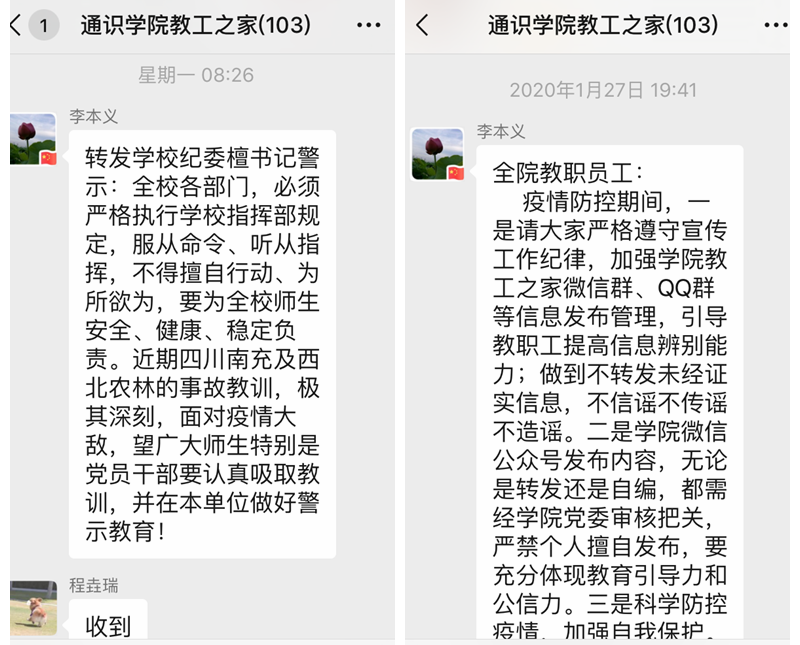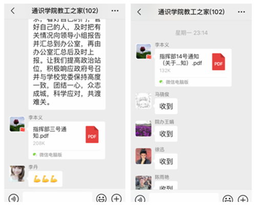 畅通信息,明确导向。学院党委坚持把牢正确舆论导向,第一时间通过电话、微信、QQ等方式将有关文件精神和指挥部所有指令传达至每一名师生员工,不定时发布疫情防控相关信息,教育引导全体教职工管好自己和身边人,对于各类非官方消息严格做到不听、不信、不传,积极传播利于疫情防控的正能量。学院值班人员每日定时收集汇总各部门疫情排查信息,按时做好“零报告”“日报告”“周报告”工作。