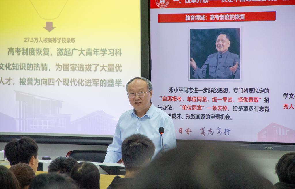 授课过程中,谢红星特别提到“改革开放是决定当代中国命运的关键一招”,并从经济、思想、教育等多个维度出发,详细剖析了改革开放的历史背景和迫切需求。他结合自己的亲身经历,将改革开放前后的生活方式进行对比,使学生们深刻感受到党的十一届三中全会是“伟大的历史转折”,改革开放是“决定当代中国命运的关键一招”,让中国实现了跨越式发展。