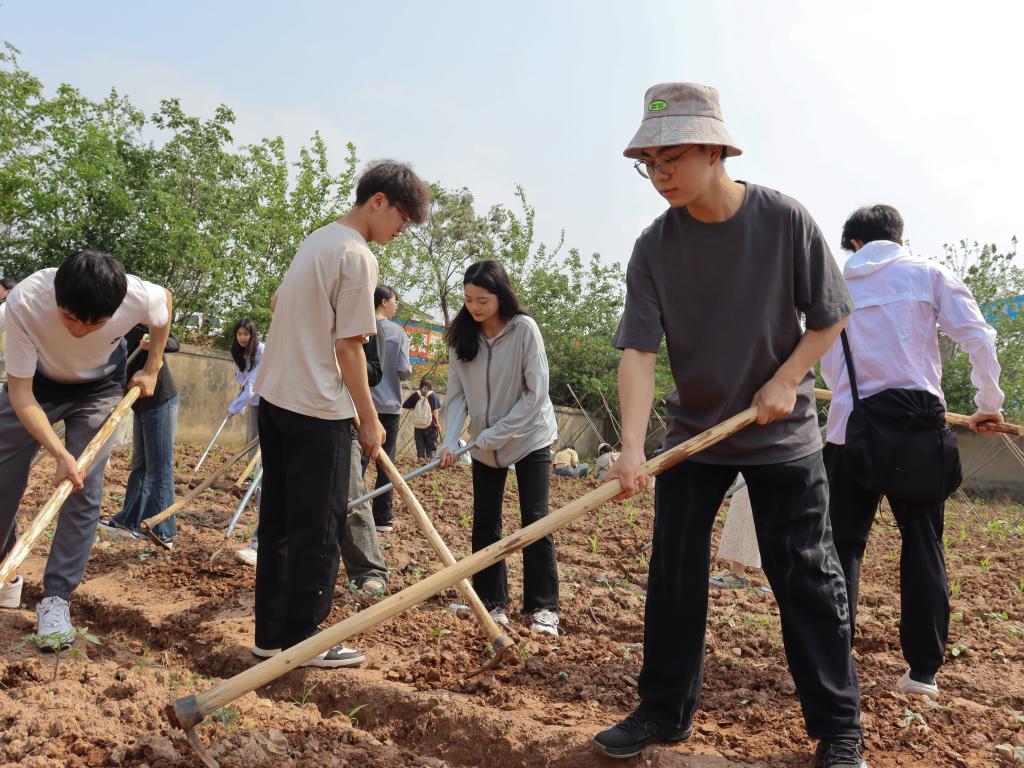 “砰、砰……”6月5日下午,阳逻校区的新菜地处,波斯菊开得正盛,2023级密码科学与技术专业的学生们提起大铁锹,卷起裤脚下地干活,竞相为红薯苗松土。