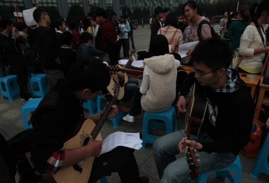 经过前期紧锣密鼓的准备和卓有成效地宣传后,10月20日上午各个社团统一乘车来到阳逻校区开展招新工作。此次招新活动现场由长桌围成正方形,供各社团招新;中间则设总服务台,为大一学子提供咨询,保障招新有序进行。刚一下车,各个社团就开始现场布置工作,一切就绪后,只待新生过来。为吸引更多的新生,各个社团各显神通。军事观察协会积极调动各类军事元素,协会成员统一身着常服,并用迷彩布罩着桌面,在桌上摆放着各式军事图片,桌旁则斜靠着高仿美式冲锋枪;书法协会则坚持“中国风”,用一幅幅协会成员自己的精美书法作品展现社团魅力;笛箫协会用悠扬婉转的笛声俘获了一批粉丝;同样是现场表演,双截棍协会在会场中央将双截棍舞的虎虎生风气势非凡。招新现场最具人气的莫过于轮滑协会和“唐人街”街舞队了。时尚动感的轮滑协会凭借精湛的技术一次次做出各种令人惊叹的高难度动作,旋转、跳跃、单脚S型前溜等各种姿势顺手拈来,让人叹为观止;而“唐人街”用令人血管膨胀的动感音乐和充满律动的舞姿吸引了里三层外三层的围观,特别是协会成员们配着《江南STYLE》的音乐集体舞动时,赢得现场阵阵尖叫声与欢笑声。阳逻校区一位学生禁不住感叹:学校社团文化真是丰富!