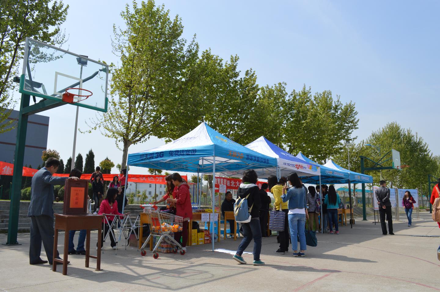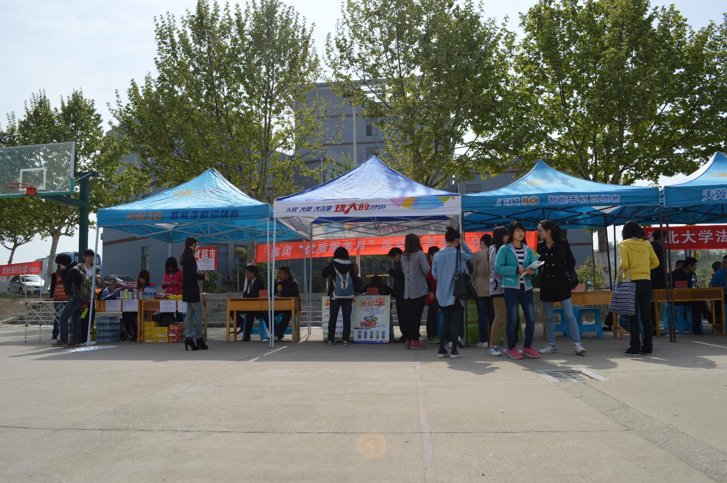 12日上午九点半的篮球场上,若干个伞篷、七张木桌、两张展示牌和一个募捐箱搭建成了一个小型的展示区。展示牌上活动的内容清晰在目,主要内容有:开展向“厚情”助学基金捐款活动;免费为师生维修台灯、收音机等小家电;请电信、移动两个通讯部门为师生提供免费咨询服务;银行现场咨询服务;食品卫生安全宣传教育活动;超市为师生让利销售及派发赠品活动以及现场为学生宣传咨询宿舍开水、热水使用情况。一张木桌形成一个专区进行上述活动的一项内容,有专门的工作人员在此为学生提供服务。