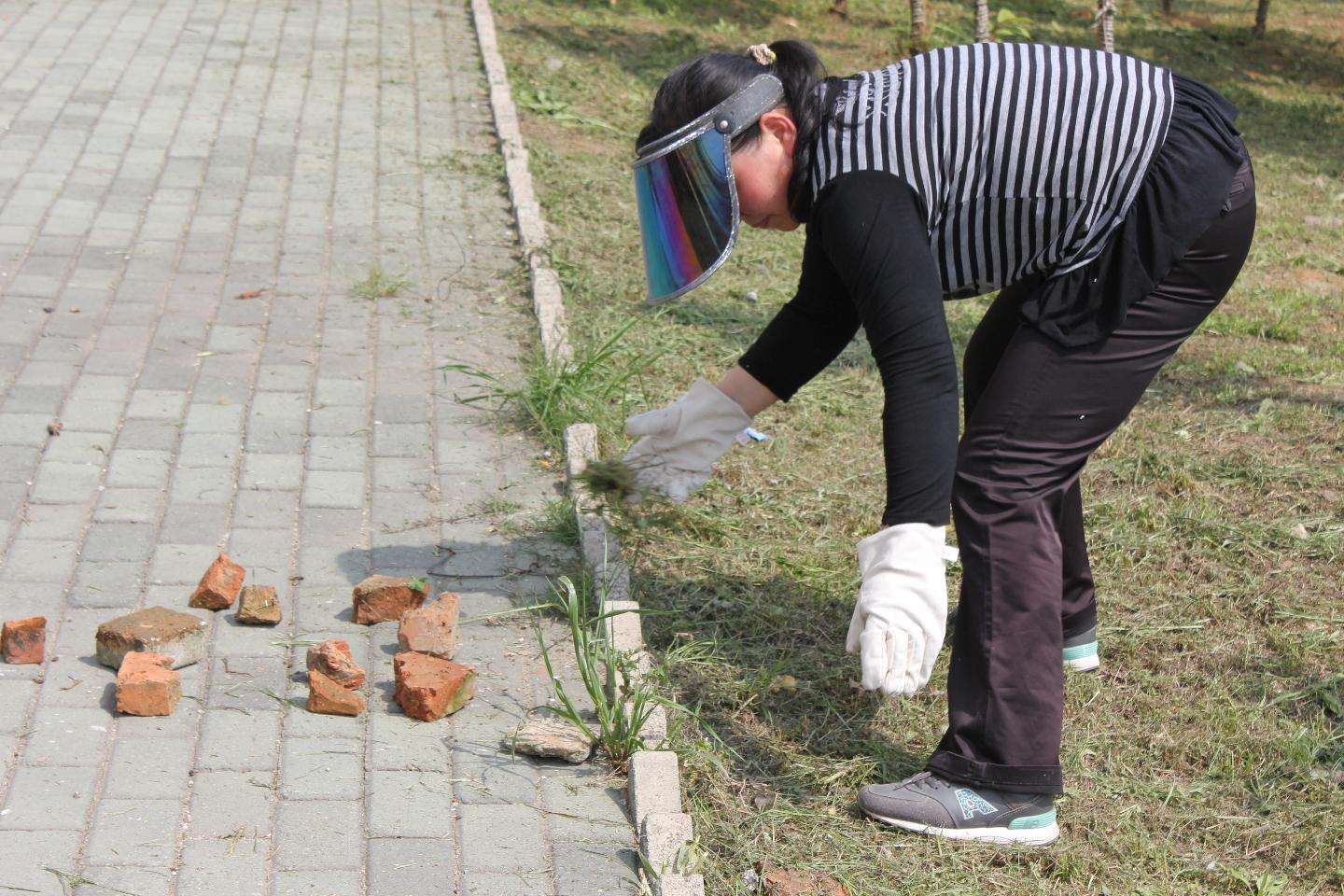 “大家都戴好手套和塑料袋,到各自的分区进行清理,尤其是死角和白色垃圾。今天天气有点热,大家辛苦一下。”后勤集团此次义务劳动的负责人对到来的工作人员说到。