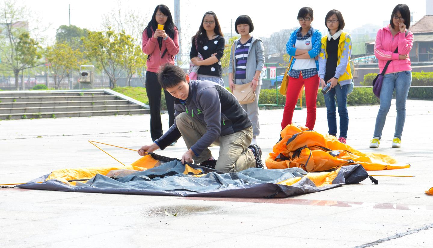(同学在休闲体育概论课上学习搭帐篷)