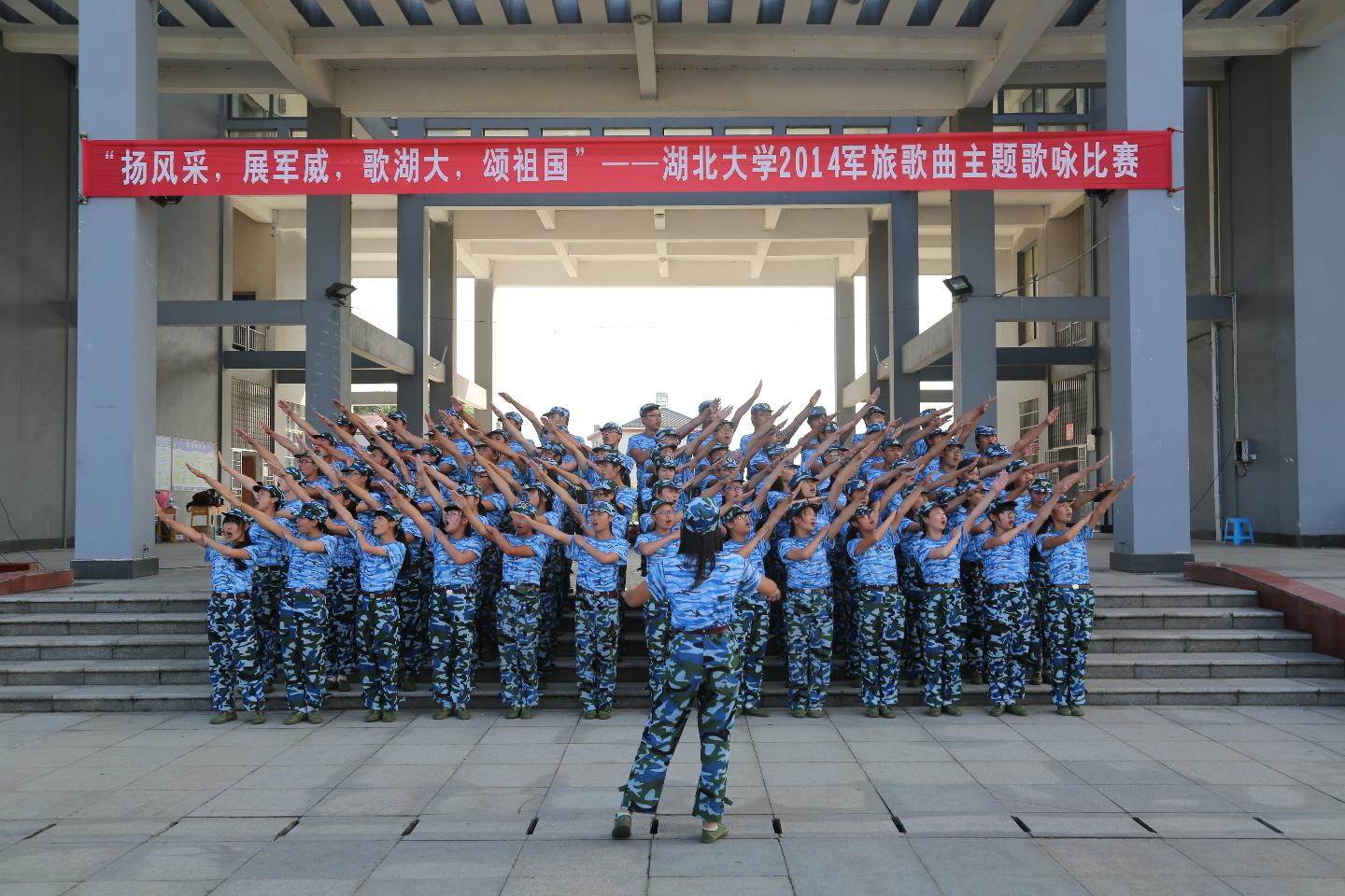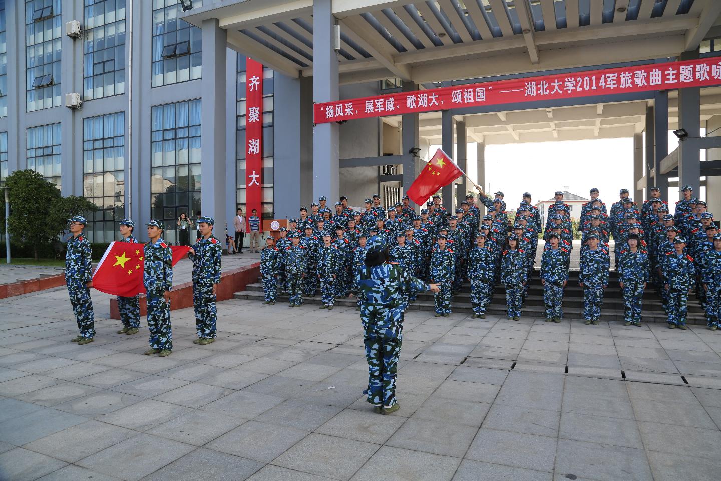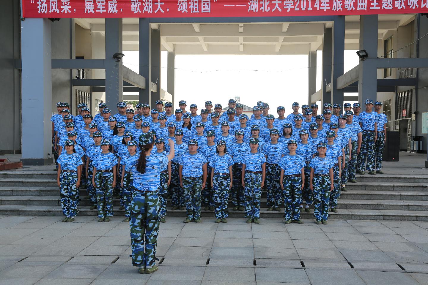 为增强新生的国防观念和国防意识,丰富学生文化生活,培养学生集体荣誉感,9月23日下午,由校团委和武装部主办的湖北大学2014 级新生“扬风采,展军威,歌湖大,颂祖国”军旅歌曲主题歌咏比赛在我院行政楼广场举行,共有10个连队参赛,16名校级学生组织成员应邀担任评委嘉宾。