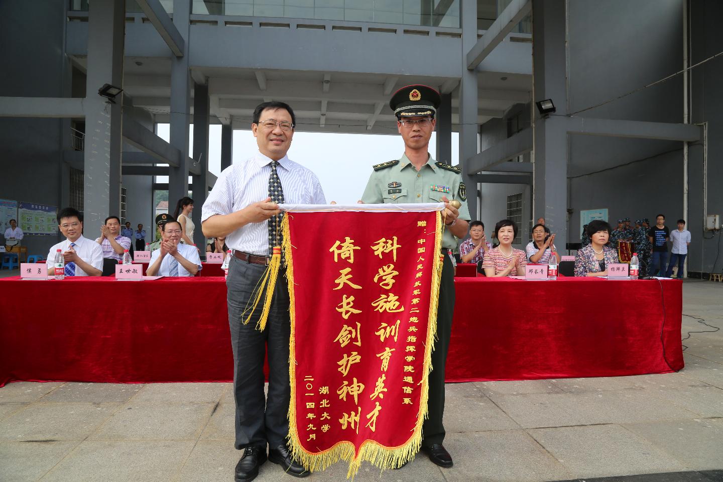 主席台就座的领导分别为优秀教官、优秀指导员、先进集体、优秀学员代表颁奖。校党委书记刘建凡向第二炮兵指挥学院赠送锦旗。