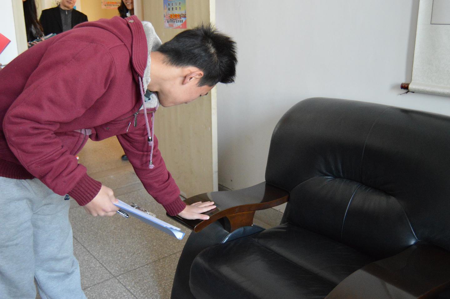 检查内容包括地面清洁、用品摆放整洁、无灰尘蜘蛛网、门窗干净、电脑电器整洁等五大方面,总分为100分。检查组一行每进一个办公室,三名学生皆以手轻揩办公桌面看是否有灰尘,微掀窗帘看窗台上是否有污垢,低头察看垃圾桶看是否有垃圾堆积并当场打分。检查结束后,学院办公室将检查结果进行通报,对得分较高的办公室予以肯定,并对存在问题的办公室提出整改要求。