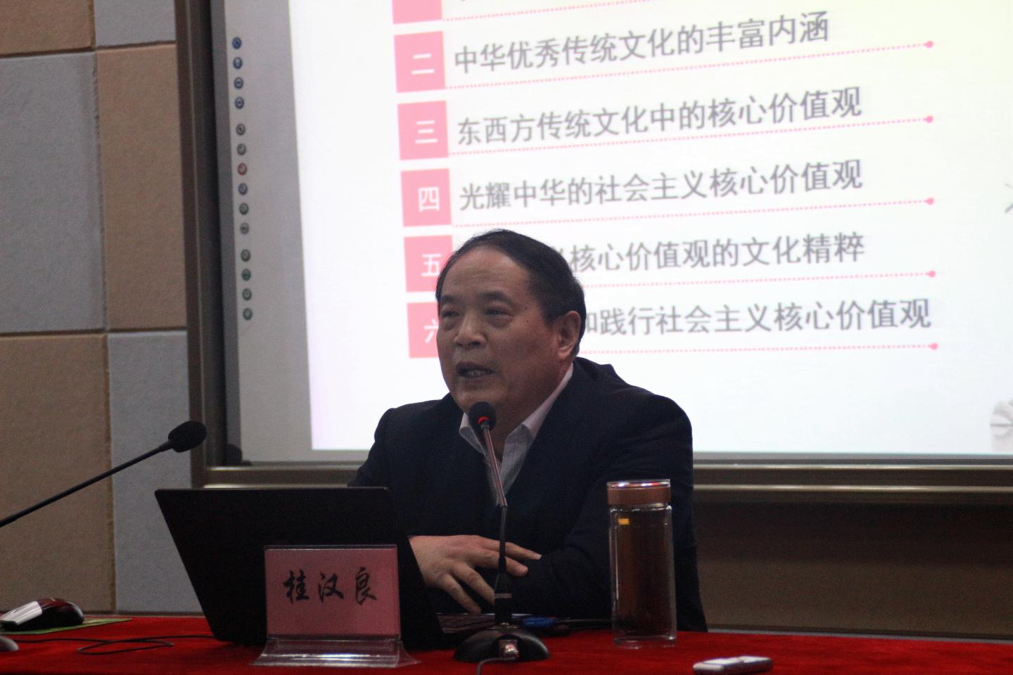 谈及社会主义核心价值观,桂汉良为大家梳理了社会主义核心价值观从产生到形成体系的发展脉络,对社会主义核心价值观的丰富内涵进行了解读。他通过全面、具体分析社会主义核心价值观中的文化精粹,指出中华优秀传统文化是社会主义核心价值观的重要源泉,社会主义核心价值观是对中华优秀传统文化的传承和升华。他还特别强调了培育和弘扬核心价值观在高校立德树人中的重要地位,并为高校师生积极践行社会主义核心价值观提出了宝贵意见。