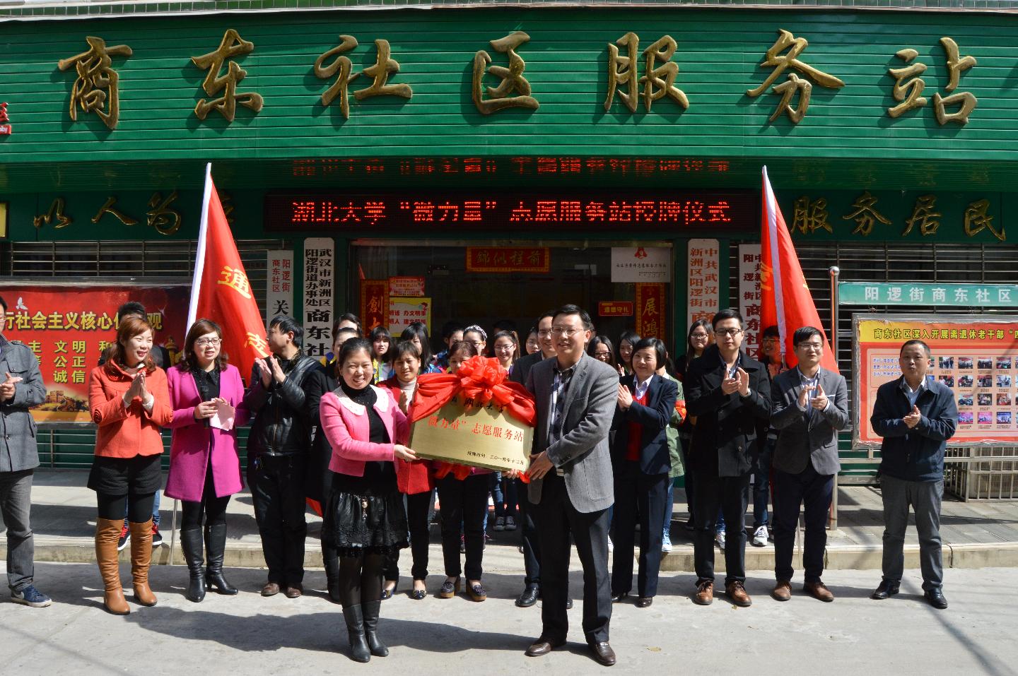 学习雷锋,我们在行动。3月25日下午,“湖北大学‘微力量’志愿者服务站”授牌仪式在阳逻街商东社区举行。学院党委副书记陈腾与阳逻街党工委副书记肖新锋出席仪式并揭牌。学院2名辅导员、22名学生志愿者代表参加仪式。