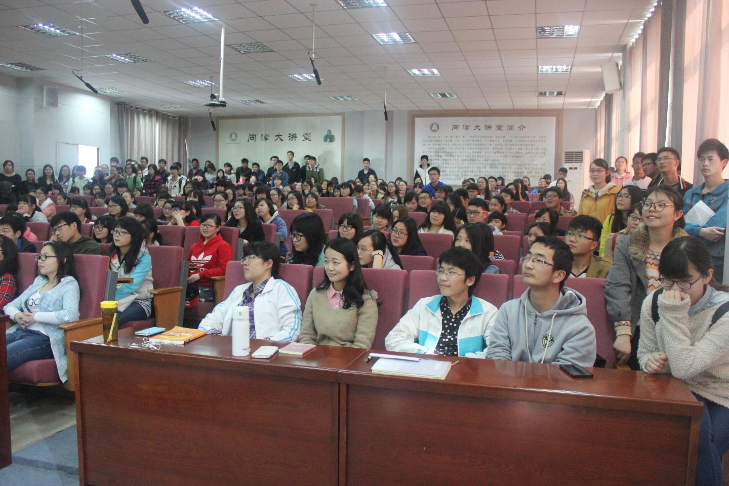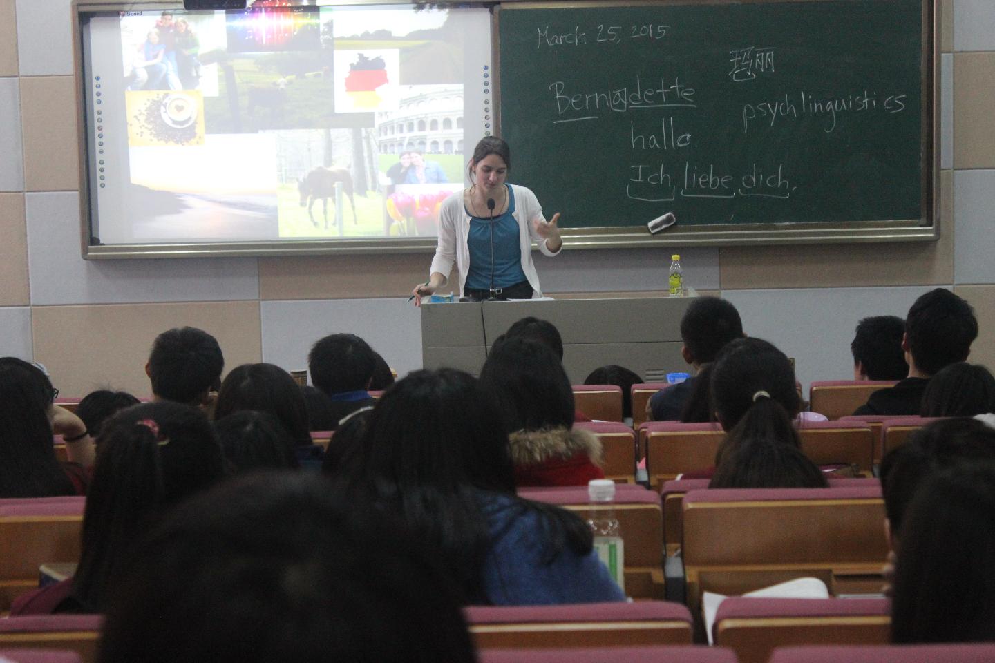 离讲座时间还有十分钟的时候,教室便已坐满了同学,教室四周墙角处也挤满了人。Bernadette分别从加拿大的官方语言、政府经济、枫叶标志、货币和风景食物等多方面做了介绍,还与学生分享了加拿大人日常的生活和消遣方式。