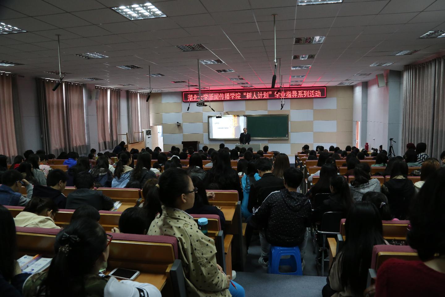 4月2日下午,新闻传播学院领导边湘义、廖声武、刘东、胡远珍、杨翠芳及优秀师生代表一行17人来院,与新闻传播学类和播音与主持艺术专业的同学开展“树人计划”主题交流,集中解答同学们关于修读双学位、转专业、就业、考研、出国等方面的疑惑。廖声武通过列举国内新闻媒体的统计数据,指出同学们所学专业的就业市场是非常广阔的,并鼓励同学们扎实学习基础知识,多读书,多参加社会实践,不断拓宽知识面,为良好的就业前景打下坚实基础。优秀学生代表则与大家分享了学习、考研、工作经验,告诉大家要注重独立人格和良好思维习惯的养成,脚踏实地,争做一名自信的媒体人。