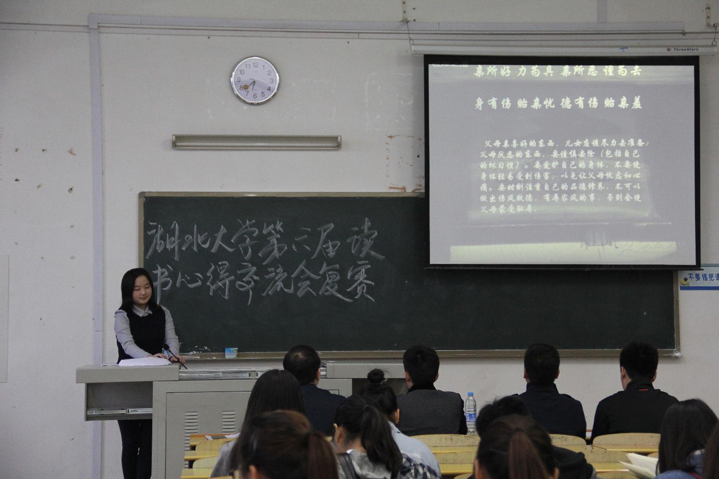 为深入开展全民阅读活动,传承中华优秀传统文化,提升师生思想修养和人文素质,4月13日晚,以“读经典·品文化”为主题的湖北大学第六届读书心得交流会复赛(阳逻校区)在我院举行。