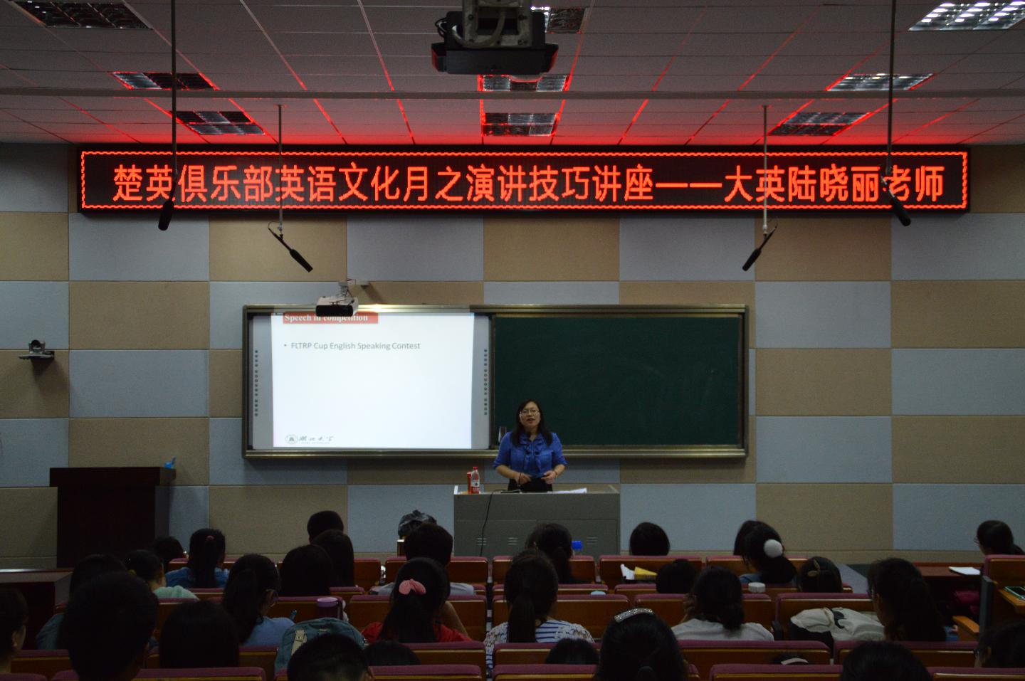 4月27日晚,由楚英俱乐部承办的英语文化节活动之英语讲座在310教室如期举行。外国语学院英语任课教师陆晓丽应邀作“Public Speaking”的讲座,传授英语演讲技巧。