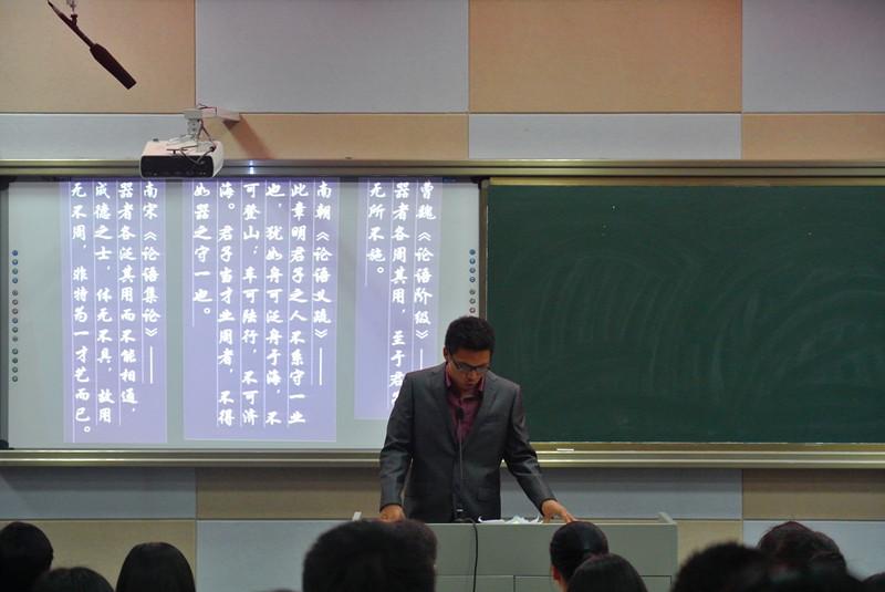 主讲学生或逐字逐句分析,或引经据典讲解,或联系现实提问。来自国际贸易与英语专业的程栋讲述了“知之为知之,不知为不知,是知也”,从治学、处事和为政讲述了人应当谦卑而好学。历史学的彭海燕以现代歌曲讲述“德不孤,必有邻”,告诉大家德行重要,互助友爱也重要。来自汉语言文学的刘硕向大家讲解“文质彬彬,然后君子”,从时代探索、个人修养以及整个人类社会三方面挖掘了该名句的涵义。来自材料化学专业的陈子从才艺、为政和平衡来讲述了“君子不器”的含义,并用化学公式和生物知识解释他对“平衡”的理解。