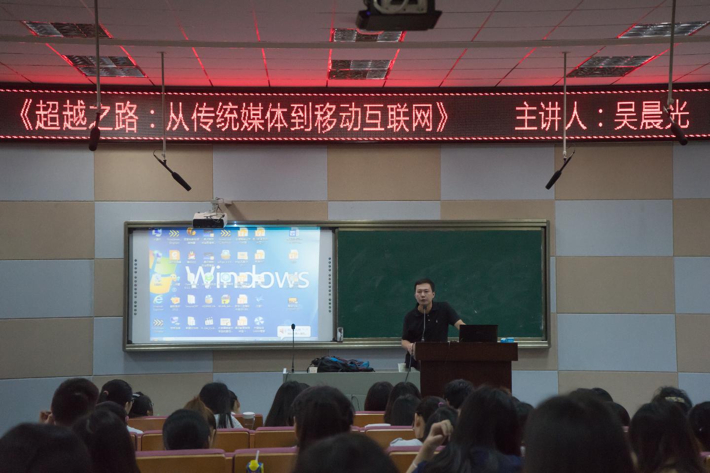 6月4日上午,移动新闻资讯应用“一点资讯”市场副总裁兼总编辑、前搜狐网总编辑吴晨光应邀做客问津大讲堂,以“超越之路:从传统媒体到移动互联网”为题,与现场200名师生共同探讨了媒体的转型之路。