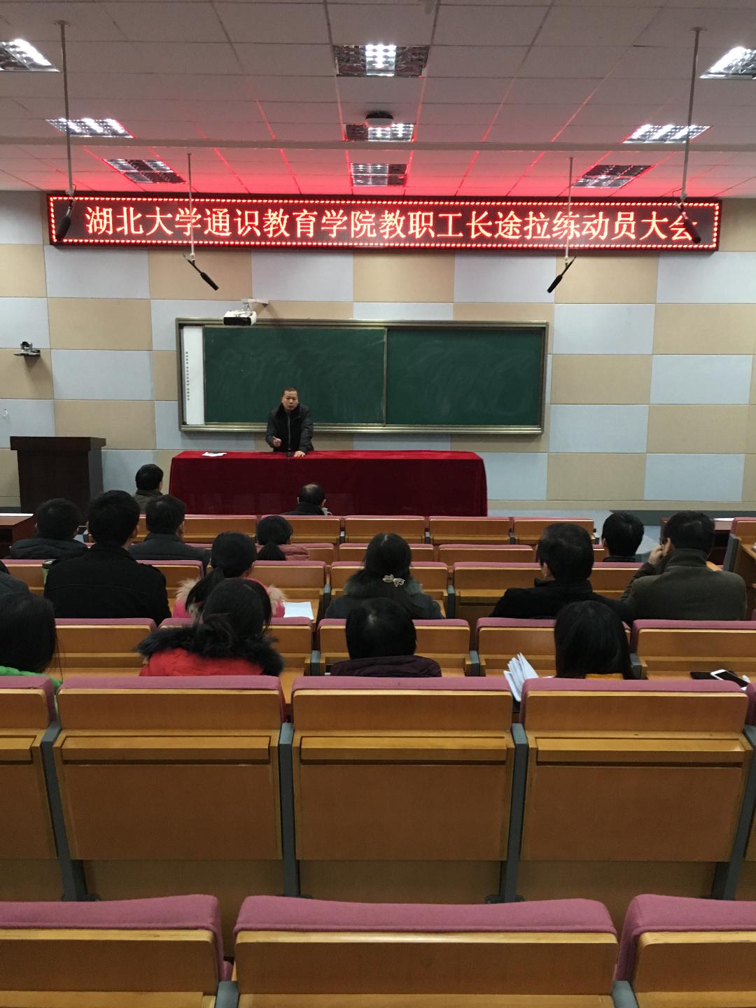 下午3:00,参加拉练活动的教职工在学院行政楼广场集中,然后乘车前往距离阳逻校区11公里的拉练起点地赛雨山。大家经过简短时间的热身运动后,便在院旗的指引下,顶着寒风,沿着阳逻倒水河大堤乡村公路向着目的地校区前进。行程跨一个乡镇,路上少有车辆行驶。大家途中相互鼓励、相互扶助,经过近2个小时的跋涉,全体拉练人员平安抵达阳逻校区。