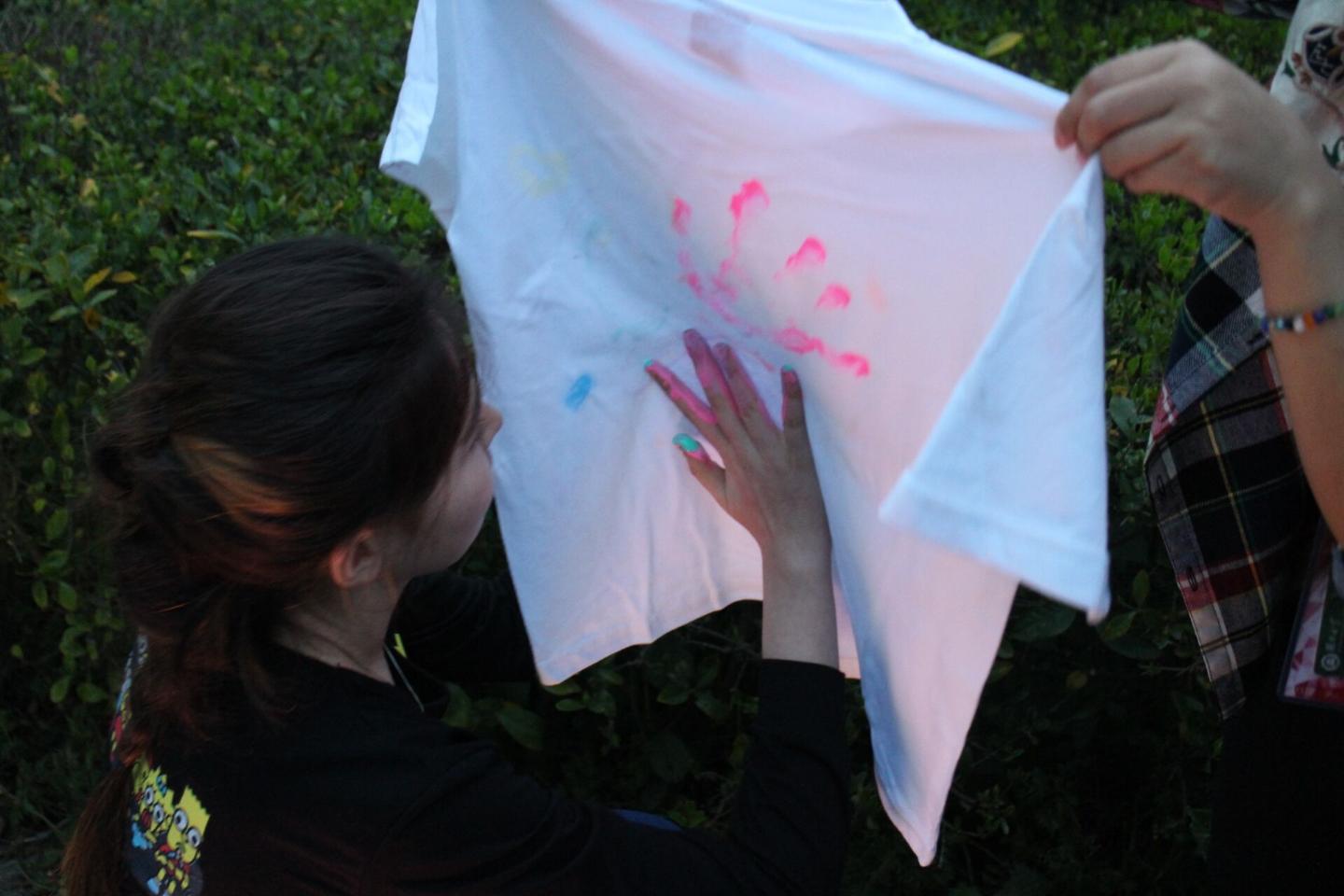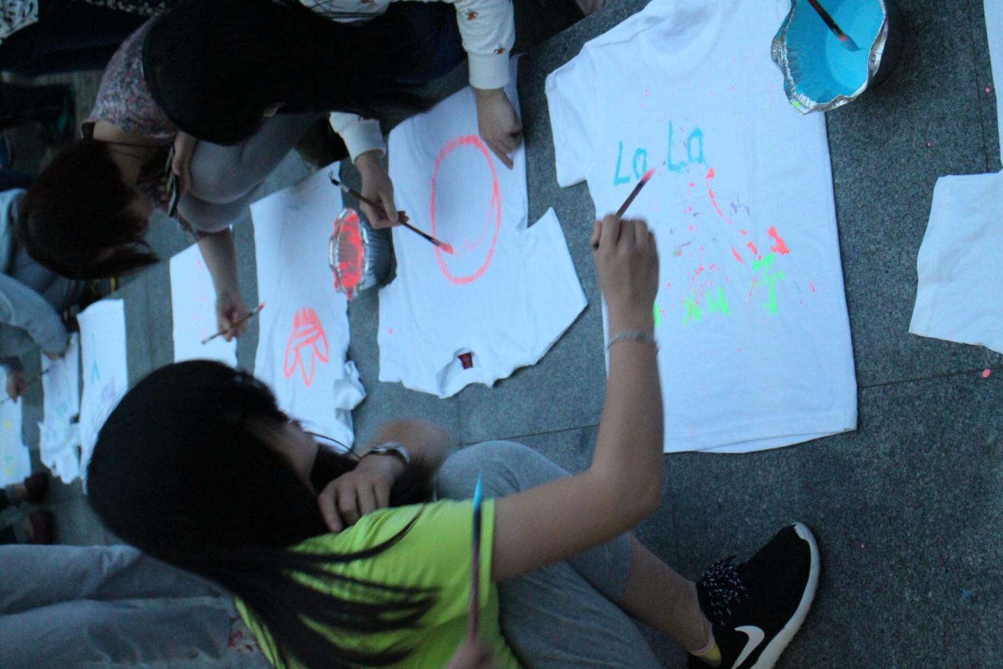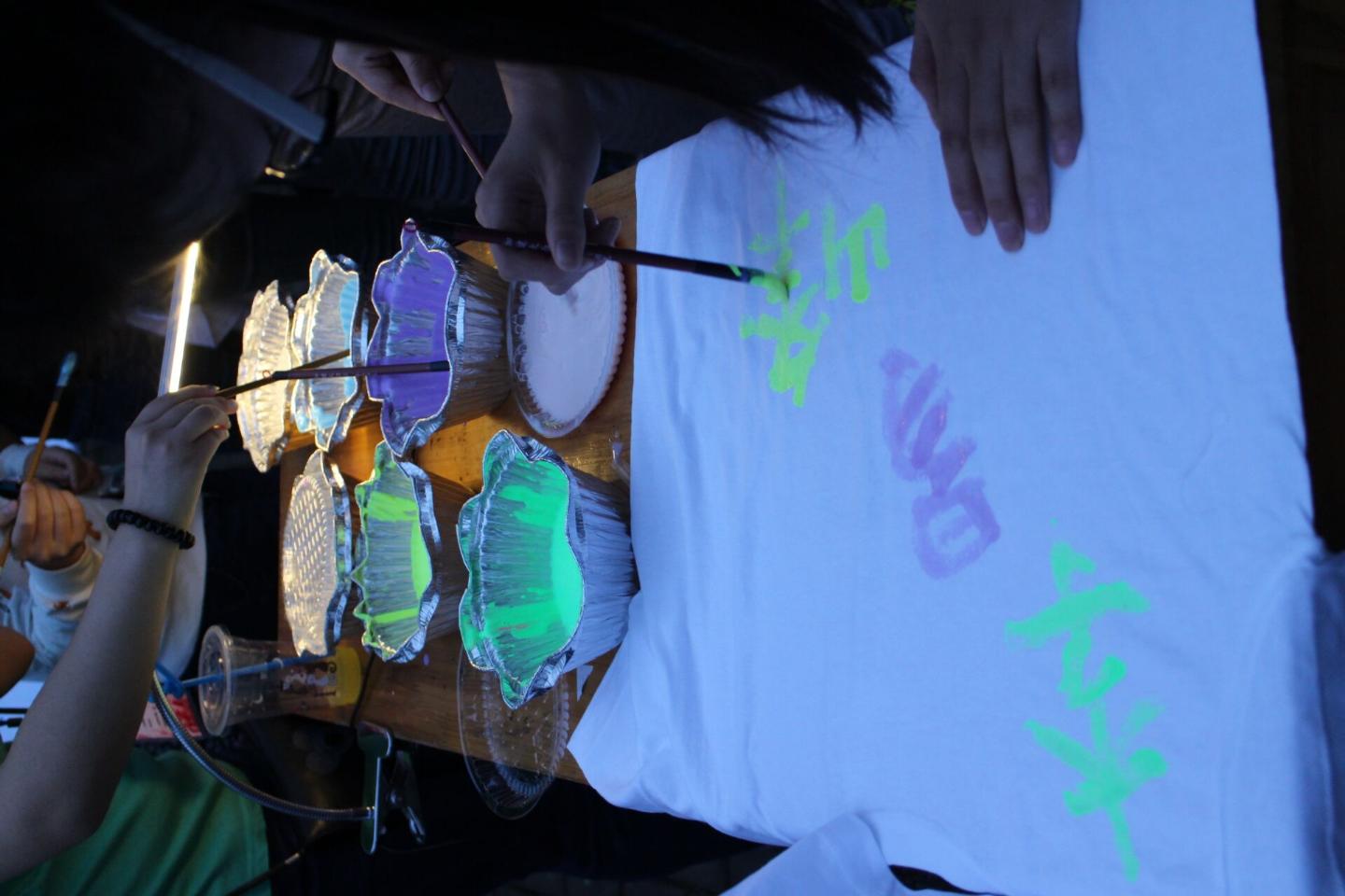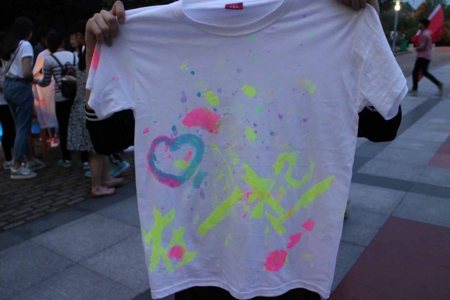 当晚6:30,报名参加荧光夜跑的同学早已排成一条长龙在等着领活动所需的T恤。在同学们涂鸦T恤的聚集处,白白的T恤上正因五颜六色的荧光粉顿时变得五花八门,有的同学T恤上写的是“某某某,生日快乐”,有的写的是自己最喜欢的数字,还有的则直接是印上自己与好朋友的手印......黑夜中的这些荧光,成为本次活动的亮点。