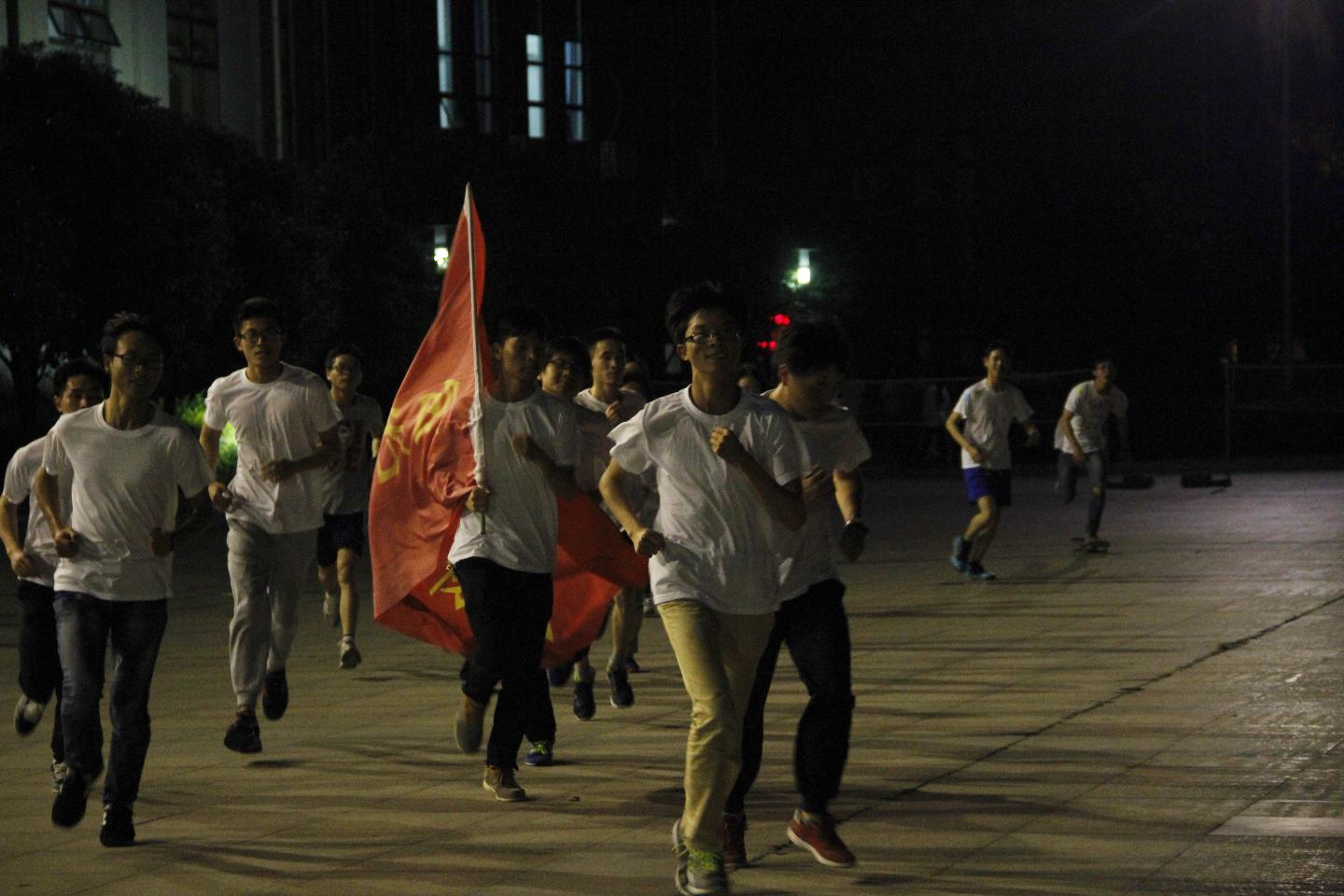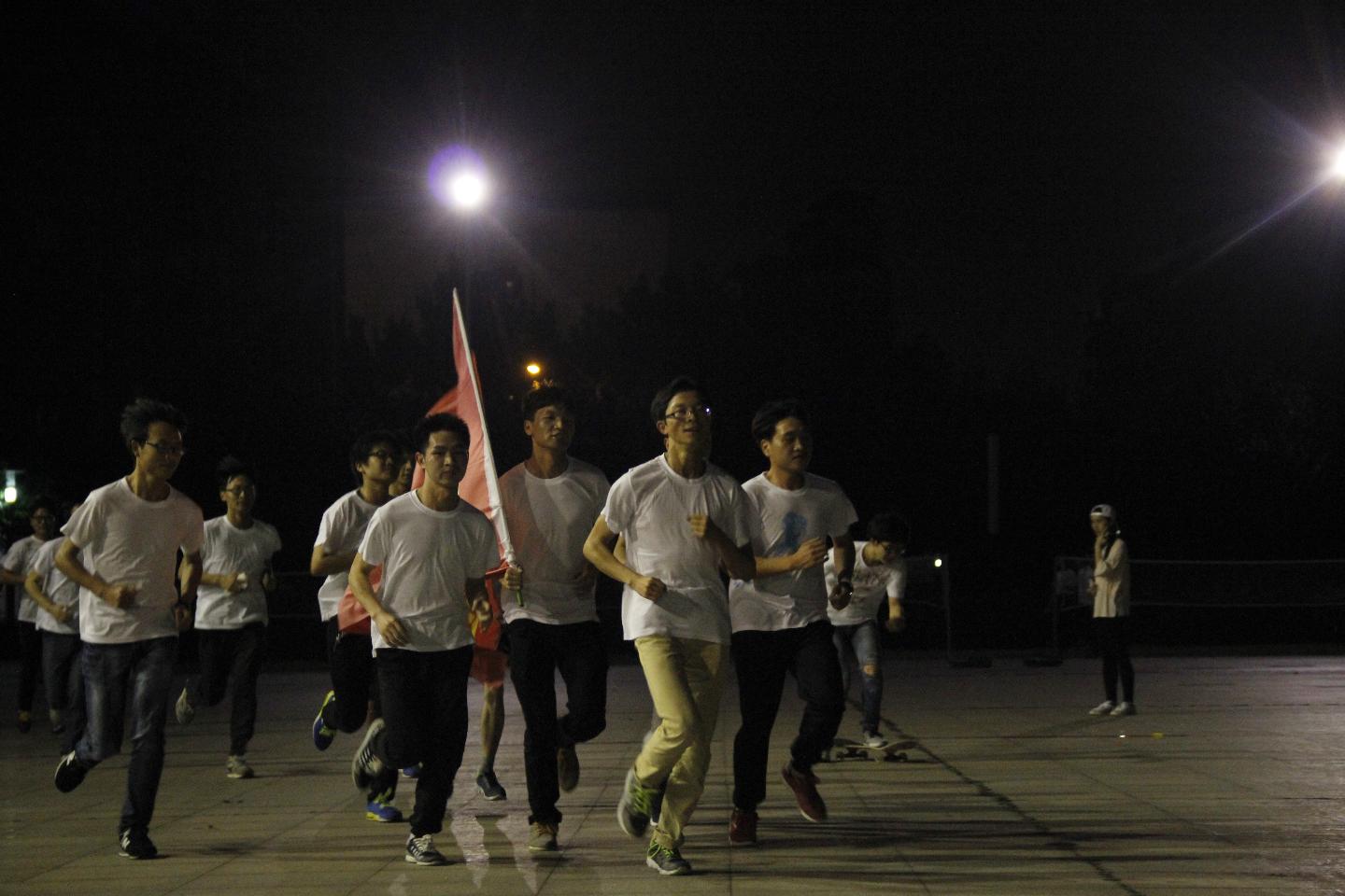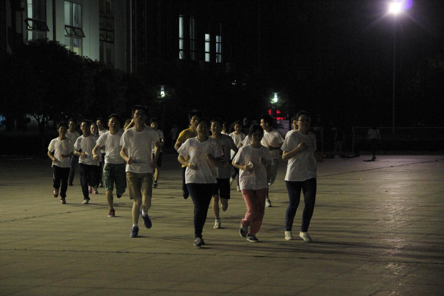 阳光长跑协会的同学搬来一箱箱的矿泉水,时刻准备着为今晚的狂欢者们服务。5000米的长跑,速度并不快,但是很有节奏。同学们一步步跑过去,有规律地调整呼吸,五步一吸气,五步一呼气,汗水滑落,湿透衣裳。跑了将近3000米的时候,大部分同学虽然已经开始乏力,却仍在坚持。鞋子摩擦地面的沙沙声与大家彼此加油呐喊的声音交织在一起,犹如群马狂奔,整个阳逻校区,在这晚被“荧光跑者”点亮了。
