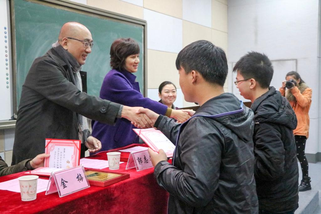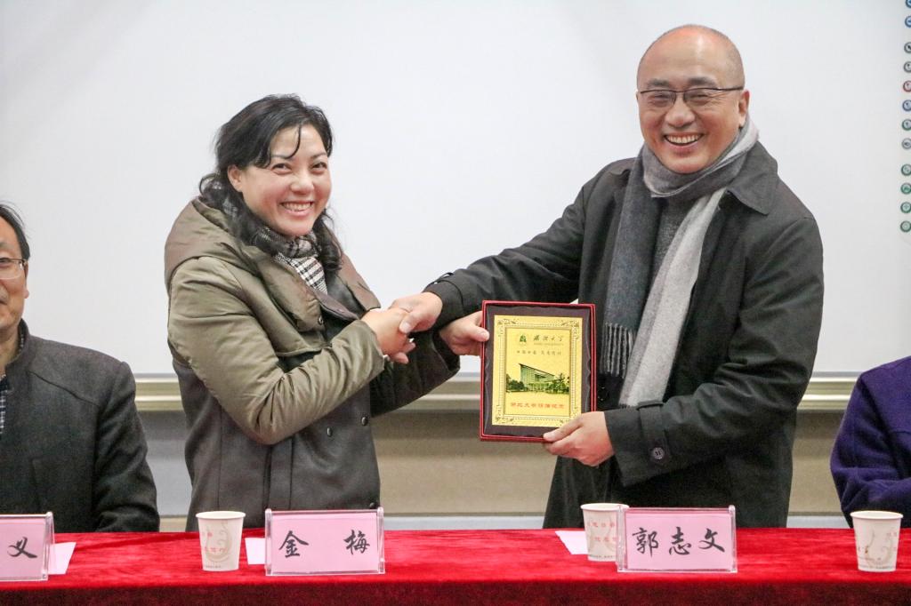 奖学金颁发仪式上,金梅向校友代表郭志文教授赠送捐赠纪念牌。