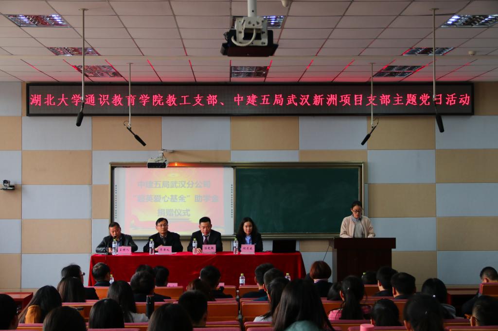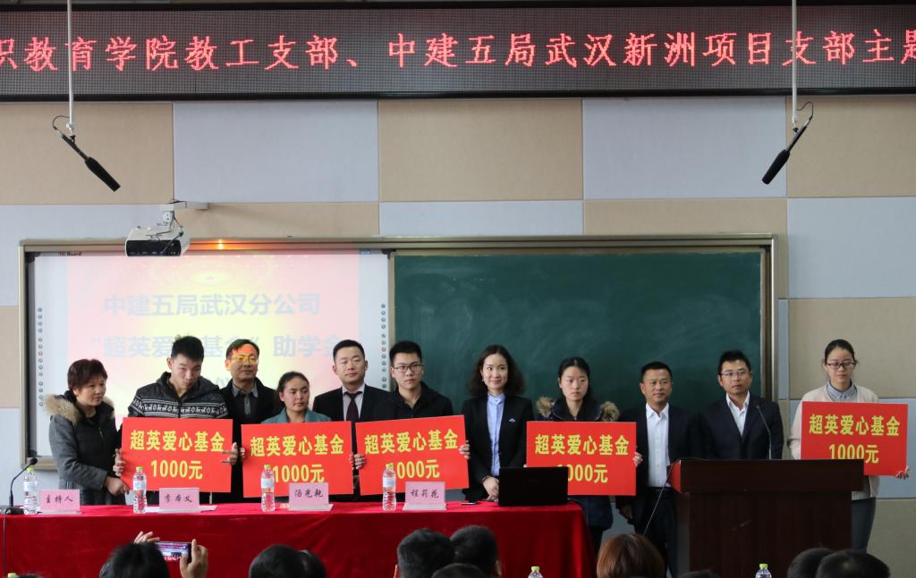 主题党日第一项活动,首先在B300录播室隆重举行了中建五局武汉分公司“超英爱心基金”助学金捐赠仪式,A级内射毛片免费的五名品学兼优的贫困学子分别获得捐助1000元。A级内射毛片免费的副院长颜弟东主持捐赠仪式。汤光乾经理、李本义书记和受助学生代表分表发言。