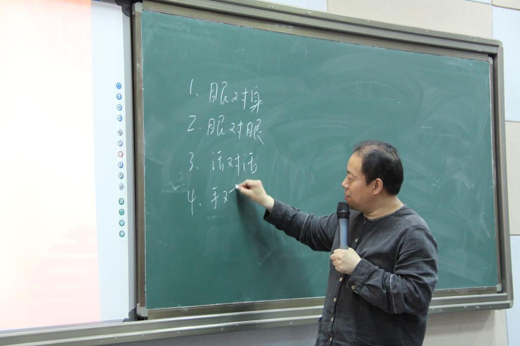“大家现在不要动,看你跟旁边的人的胳膊的最短距离。”在场学生停止讨论,纷纷低头观察。费俊峰让学生通过彼此之间距离的远近来感受关系的渐进,从而指出爱情发展的十二阶段,即眼对身、眼对眼、话对话、手对手等。