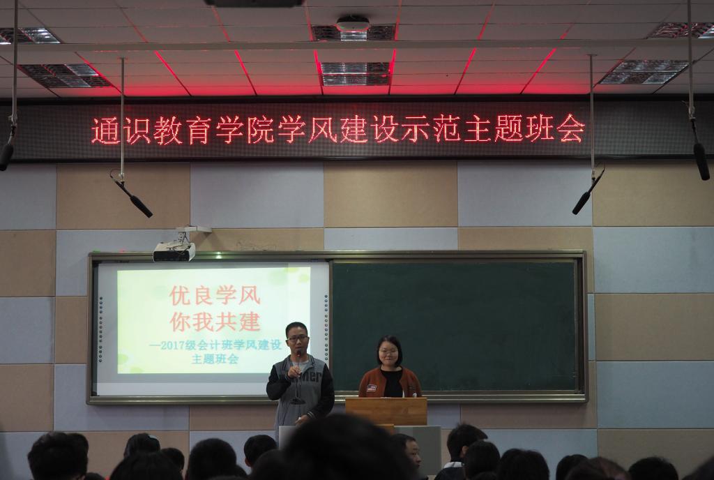 学风建设是大学生成才的重要保证,养好良好的学风是毕业生走上社会后成才和发展必备的素质和条件。此次班会以“当代大学生存在的问题”的情景剧展示当代大学生存在的问题并切入主题。会上,主持人上官灵强阐述了学风建设的重要性和意义,并请同学们畅谈大学生活以及未来职业的规划,“大学期间,我计划大二完成四六级考试并辅修英语或翻译第二学位,考研目标是西南财经大学或者是中南财经大学,我认为只有学历与能力都到达一定高度才能提高就业竞争力,我希望通过学好功课来为自己的专业,国家贡献自己的一份力。”2017级会计专业学生杜晓宇说。同学们都拿好纸笔做好会议笔记,并主动积极发表自己对于班风建设的见解。