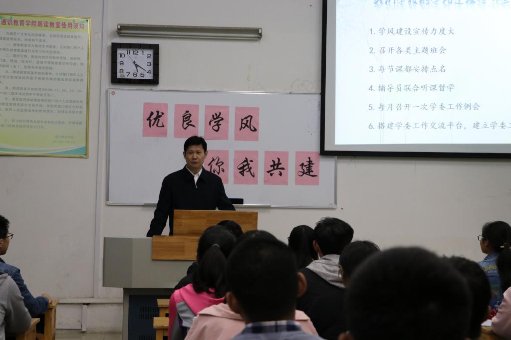 在“优秀学风,你我共建”主题班会上,赵凌云充分肯定了班会主题。他说,大学学习要扣上的第一颗扣子就是学风,古人曾说,“修身齐家治国平天下”,就“修身”而言,作为大学生就是修学风。他希望同学们能够将这种优良的学风贯穿大学始终,在学业上取得优异成绩,努力成为有理想、有本领、有担当、治国平天下的人才,为实现中华民族伟大复兴的中国梦而奋斗。