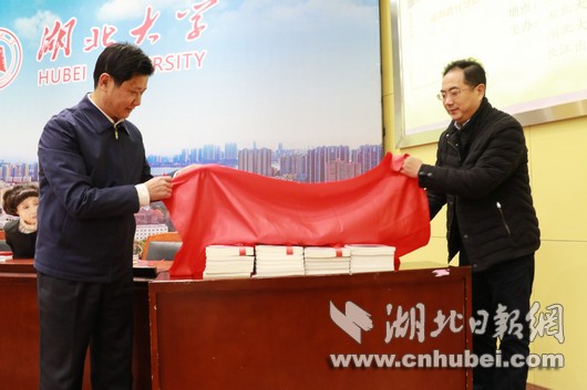 图为:湖北大学校长赵凌云、教材赞助商陈江总经理为新书揭彩