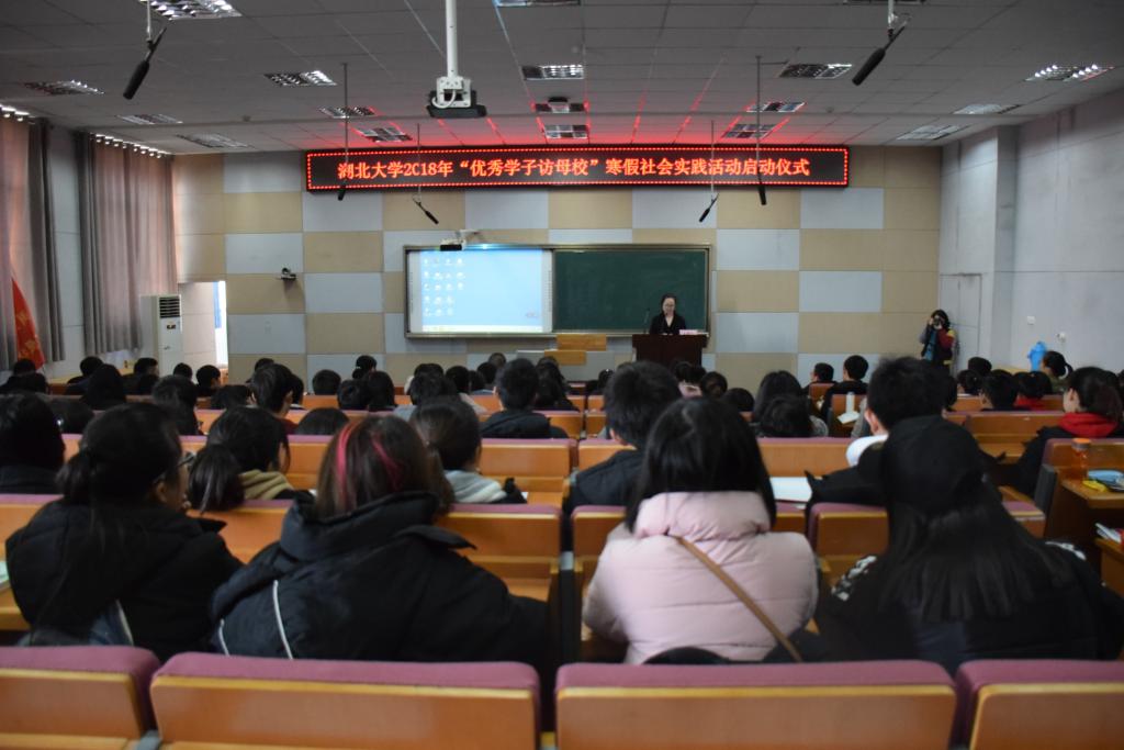 1月10日上午,湖北大学2018年“优秀学子访母校”寒假社会实践活动启动仪式在A级内射毛片免费的举行。副校长钱建国出席启动仪式并讲话。招生就业处、校团委、A级内射毛片免费的等单位负责人及150多名学生志愿者代表参加仪式。招生就业处处长李莉主持仪式。