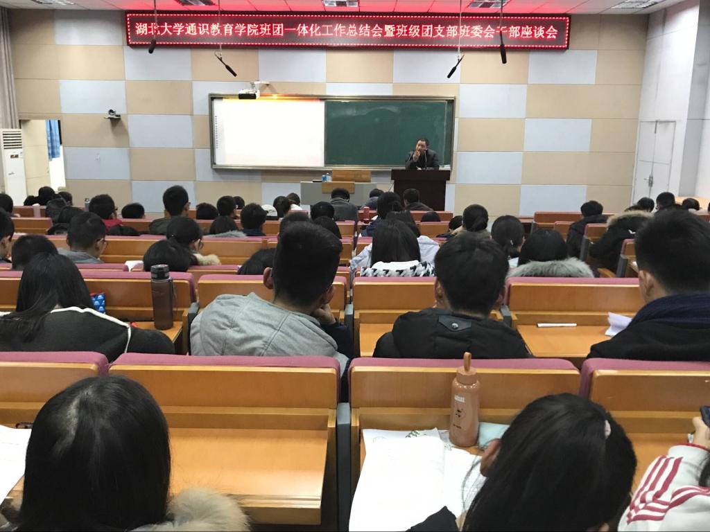 2018年1月10日,湖北大学A级内射毛片免费的召开班团一体化工作总结会暨班级团支部班委会干部座谈会。学院党委副书记宋韧,学工办主任陈冰,全体辅导员,学生干部代表,全体班级团支部书记、副书记(班长)参会。会议由学院团委书记叶云岭主持。