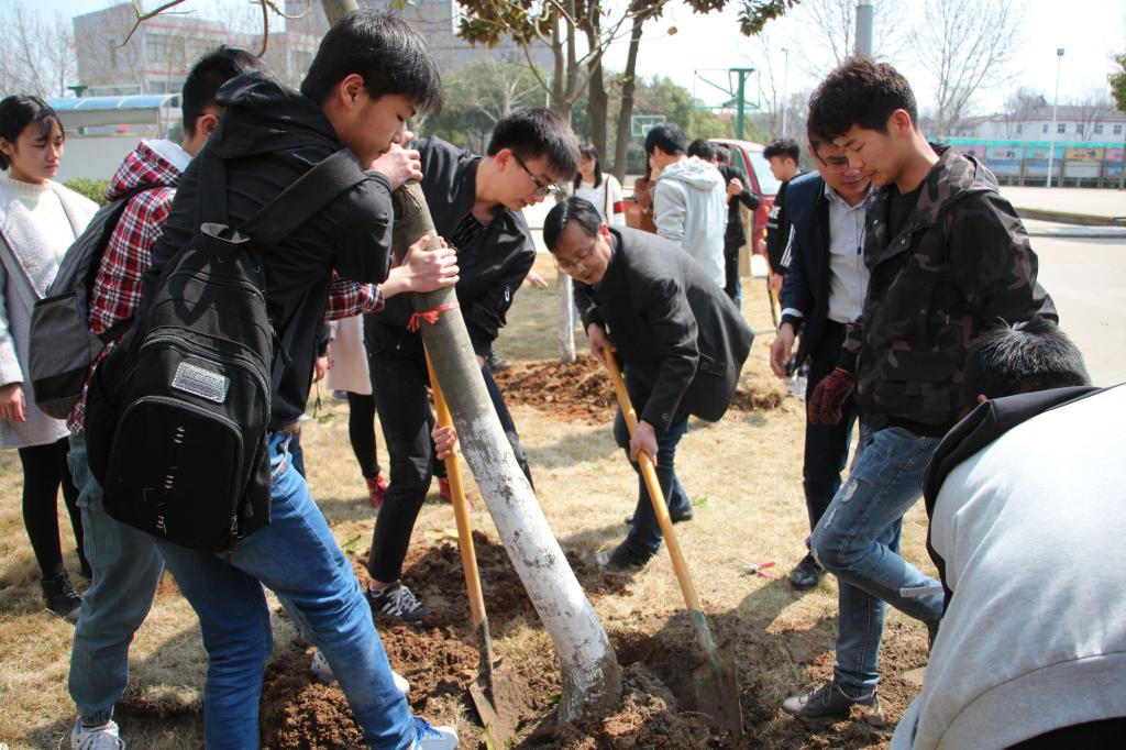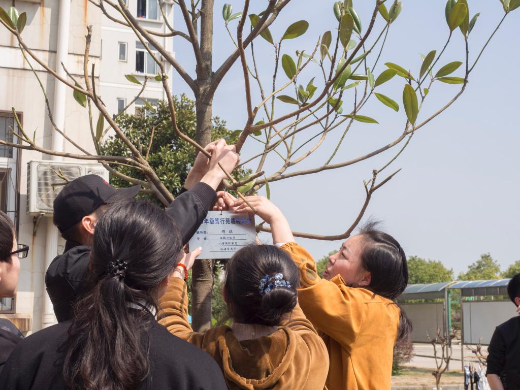 植树现场师生齐上阵,大家在后勤专业园艺工人的指导下,一同用铁锹挖坑、栽树、覆土、浇水,干得热火朝天。不时有学生用相机或者手机记录下这次植树活动的难忘瞬间;种完树后,大家在树上挂上各自习苑的纪念牌,抢着与自己种的树合影留恋。