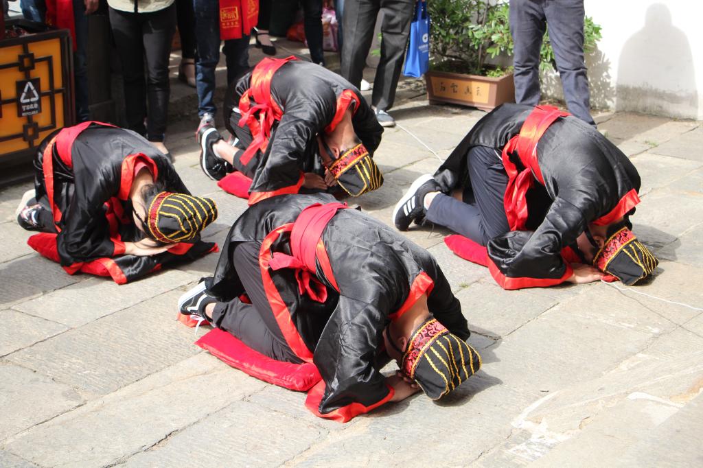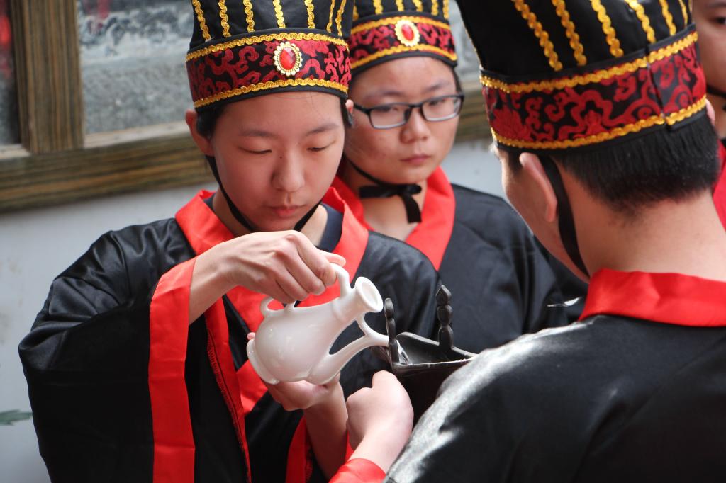 活动开始,礼生们伫立在仪门之前。一声令下,仪门打开,礼生们排着队列缓缓向书院内部行进。祭祀者们穿过讲堂,踏上阶梯,来到了供奉着圣人像的大成殿。随即,礼生们在殿前对孔子圣像行跪拜礼。这之后,便是正式的祭祀,祭祀过程中有诵读《论语》名句、有敬酒、有跪拜圣人,一切均按照古礼旧制进行。整个活动现场被围观人群堵的水泄不通,大成殿前甚至连一处落脚的地方都没有。